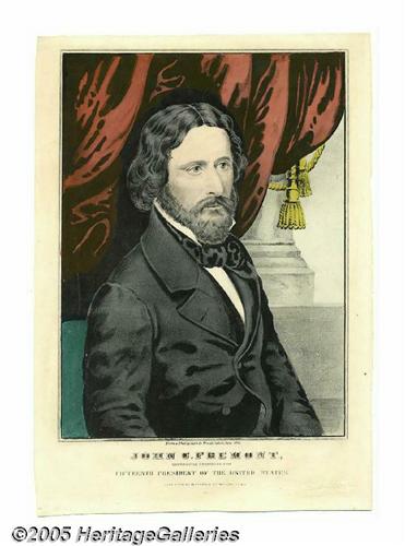 <B>Unusual John Fremont Campaign Print by Currier</B></I> 10" x 14" hand-colored small folio lithograph published by Nathaniel Currier in 1856, titled "John C. Fremont, Republican Candidate for Fifteenth President of the United States. From A Photograph By Brady Taken June 1856." Fremont was nominated in June 1856 in Philadelphia, as the first presidential candidate of the fledgling Republican Party. He is shown here posed by a chair beneath some flowing draperies and a hanging cord. The vibrant colors include crimson, green, yellow and flesh tone. The condition of this scarce print is excellent. Lot:256