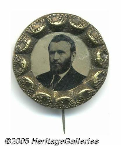 <B>Unusual Large, Fancy Ulysses S. Grant Ferrotype Pin</B></I> An 1872 rather than 1868 pose, in a high-relief hollow shell frame we do not recall seeing before. Great condition, with original pin. 27 mm. Lot:258