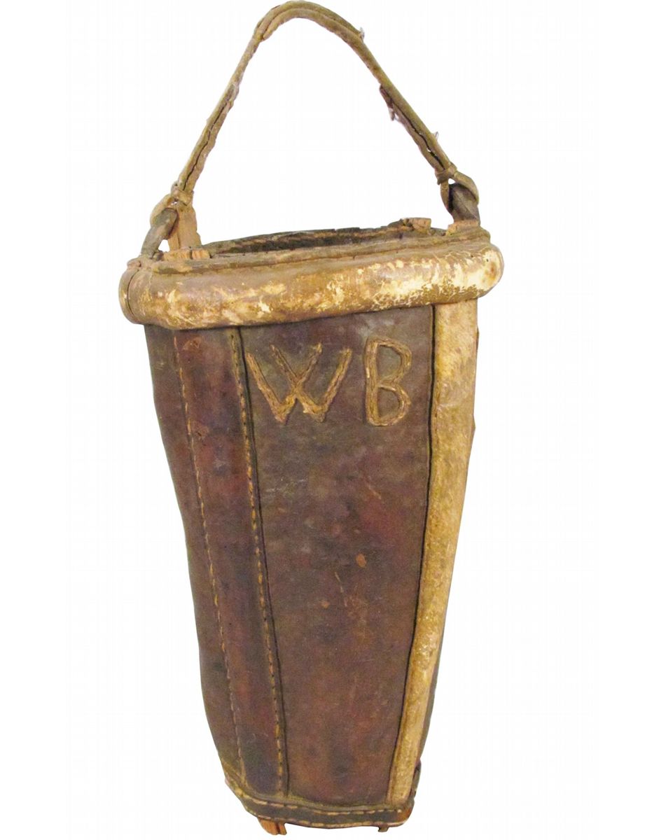 Unusual Leather Fire Bucket. Reinforcing wooden staves sewn inside to reinforce shape. Complete with rawhide handle and initials. Good condition. 13 inches tall.