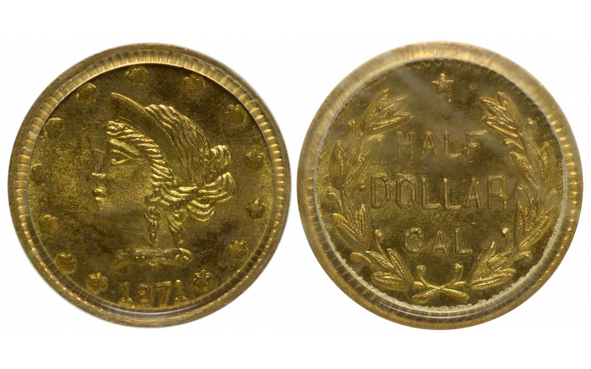 Issued by Leavenworth, Kansas, jewelers Hershfield Mitchell; one of the coins that got them arrested! Rare. Gem Brilliant Uncirculated, pristine fields, needle-sharp strike, bright gold color. PCGS MS66. Finest known. Ex Heritage Exclusively Internet Auction 12/12/2000, Lot 3009. Serial# 1375006 Bergen-Istvan Collection HKA#63857