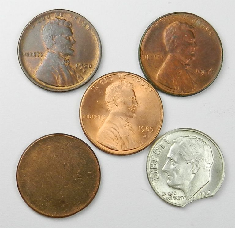 1920-D. Red and brown Unc. Also, 1944 off-center chatter strike or double struck example, Unc as well as 1985-D RPM, BU and blank flan, EF along with Dime, 1964-D, bottom obv elliptical clip, Unc. 5 coins.