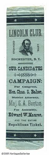 <B>Unusual Local Candidate Ribbon with Lincoln Association</B></I> This 2" x 7" powder blue satin ribbon was issued by the "Lincoln Club. Rochester, N.Y. Organized 1879." It lists three candidates endorsed by this post Civil War Republican organization. The graphics are quite nice and condition is excellent. Lot:258