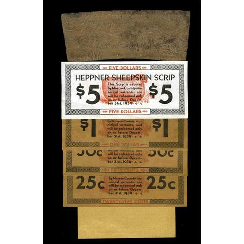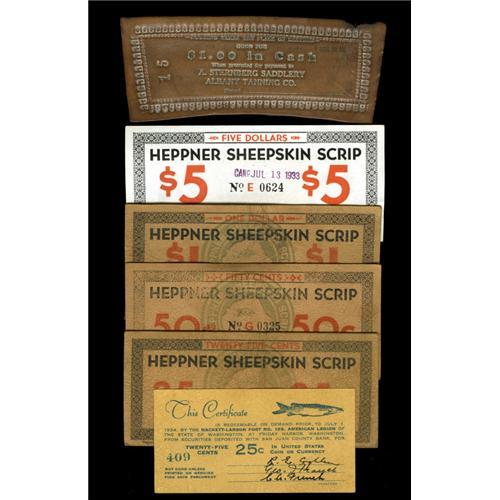 <B>Unusual Material Depresssion Scrip.</B></I><BR><B>Albany, OR- A. Sternberg Saddlery</B></I> $1 Mar. ?, 1933 Shafer OR75-1a1<BR><B>Heppner, OR- Business Men of Heppner</B></I> $5 Dec. 31, 1934 Shafer OR165-5 <B>CU,</B></I> rubber stamped cancelled<BR><B>Heppner, OR- Business Men of Heppner</B></I> 25¢; 50¢; $1 Dec. 31, 1934 Shafer OR168-.25A; .50B; 1A<BR><B>Friday Harbor, WA- Hackett-Larson Post No. 165 American Legion</B></I> 25¢ Shafer WA126-.25 <B>CU.</B></I><BR>The Sternberg piece is of the large leather rectangle variety; the $5 Heppner piece is of the paper variety; the 25¢, 50¢, and $1 Heppner pieces are of the leather varieties; and the Friday Harbor piece is an example made from fish skin parchment. The leather pieces are in nice condition.