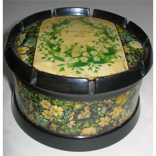 The top also has a decoupaged panel with Lily of the Valley surrounding the words "Dinna Forget the Giver".