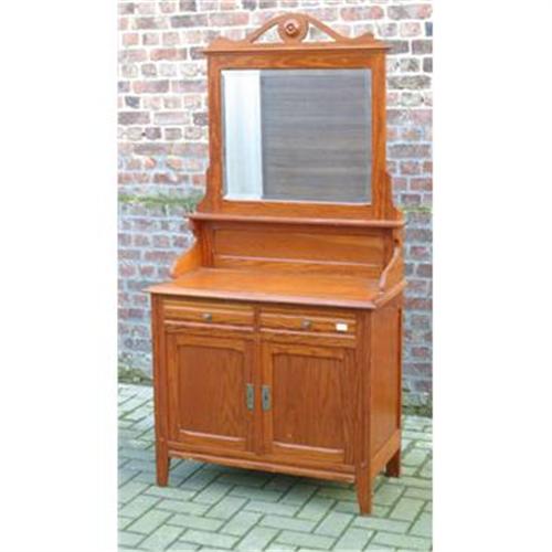 This is a Beautiful Napoleon III Style Pine Dresser. Made in Belgium around 1910 it is in exceptional condition. Very Simple but at the same time elegant. Having the small shelf and side pieces makes this piece very unusual not to mention it is made from Pine which has been stained a honey brown. It has a nice simple crest and a beautiful beveled mirror. It is extremely clean and solidly built. Has two drawers and two bottom doors which open up to a nice size cabinet which includes one shelf. The bottom cabinet doors come with a key and the lock does work. Has lovely wood grain patterns. Good quality piece of furniture that is ready to be placed in your home. For additional photo's or information on this piece please contact us by clicking on the "EMAIL DEALER" button, we'll be happy to supply you with any information on this piece that is requested including a shipping quote if needed. Thank you for looking.
