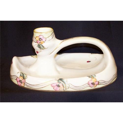 Very unusual shaped Nippon chamberstick or candlestick. I have only seen one other in this shape. I was unable to get a good photo of the backstamp because it is so faint, but it is the JVP #33 cherry blossom mark.