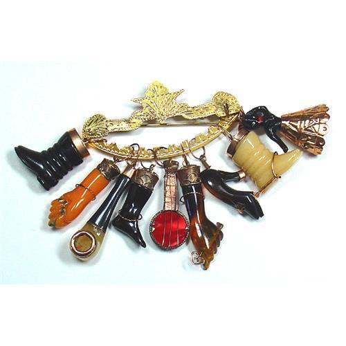 9Kt yellow gold pin with nine dangling charms: a black boot with gold cuff, a yellow forearm with gold bracelet, a black and dark yellow pipe, a black leg with gold anklet and rim, a red banjo with gold arm, a brown and gold forearm clutching a gold key, a brown and gold shoe, a white boot, and a black African woman in a gold native skirt. The pin is gold, engraved with decorative motifs. It opens and the charms are detachable. The "Penca de Balangandan" is a religious object, created by African slaves brought into Brazil. Each balangandan had a meaning of its own; each penca is a set of several charms, symbolizing good luck. Some say the penca was given by a slave master to his slave as a reward for good behavior.