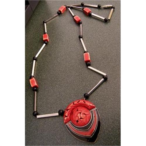 What a beautiful and interesting piece of jewlery! We'll start with the beautiful carved top of the pendant accented with salmon and black enamel. On the reverse side of the pendant very small at top it is marked MADE IN FRANCE. This pendant stands alone as a most georgeous piece, but it obviously meant a great deal to it's previous owner. Someone has engraved names and/or initials on the back which is very endearing. The beads are strung over a silver chain, with one of the silver bars showing wear next to the clasp. Lots to love here! If you have any questions or would like more photos, please e-mail. I will quote exact shipping at time of purchase or on request. Thanks for looking.