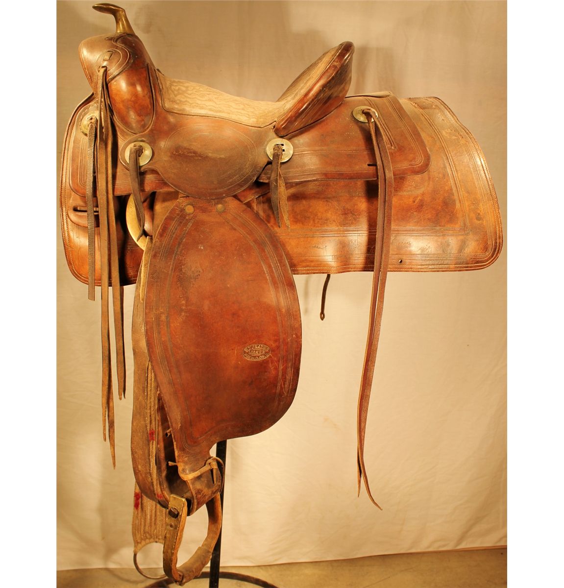 RT Frazier Pueblo CO Saddle; an unusual saddle with a quilted 14" seat, square skirts with border tooling, brass horn, in very nice condition and a terrific appeal.