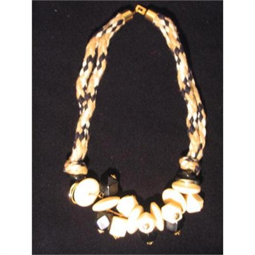 This fascinating necklace begins with two black, tan, and white rope-braided strands connected in the center by a metal chain beaded with cream and black irregular Lucite chunks, modified hook clasp. Length: 19 in, Width: approx 1 1/2 in.