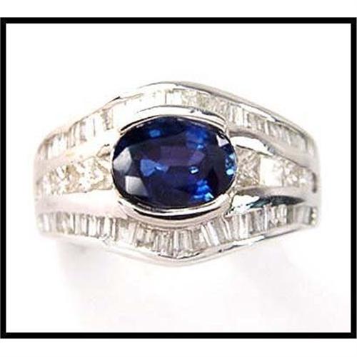 Deep, vivid, rich color sapphire has excellent brilliance. It weighs 1.30 carats. The diamonds are both princess cut and baguettes with combined weight of 1.5 carats. 18K white gold ring is the work of a top goldsmith as it is clearly shown. Total weight is 7.3 grams. Size 7. Measures 13mm (1/2") long.