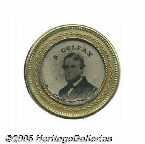 <B>Unusual Schuyler Colfax Ferrotype Shank Button, Possibly a "Hopeful" Issue</B></I> During the mid-19th century, we saw the dawn of jugate items which also carried an image of the Vice Presidential candidate, but surprisingly few items pictured the V.P. candidate alone. Accordingly, one must wonder whether this was, in fact, issued for Colfax as Grant's running mate or as a presidential hopeful. He certainly had enough national stature to have received serious consideration as a possible presidential candidate. There is light wear on the portrait, and some minor emulsion bubbling not affecting the portrait. Still a very displayable example of an unusual item. From the former Joe Brown Collection. 23 mm. Lot:259
