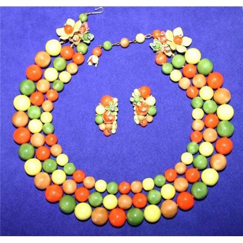 <table width="100%" border="0" cellspacing="0" cellpadding="4"><tr><td><em> A FABULOUS FIND!</em></td></tr><tr> <td width="100%"> The perfect spring and summer Parure! This fabulous vintage 1940s Coro Necklace and Earrings set uses plastic beads and brass metals that are enameled in bright colors of yellow, lime green, orange and tan creating beads, Tulips and flowers that are adorned with prong set Chaton Rhinestone centers. The Necklace consists of three strands of alternating size beads and reminds be of a big bowl of fresh fruit salad! YUM! The Necklace measures 18 inches long including the 3 inch long beaded extender. The fabulous hardware floral motif on the Necklace matches the Earrings which measure 1 ¼ inches long by 1 inch wide securing with a clip-back closure. Substantial weight well made bright and very fun!