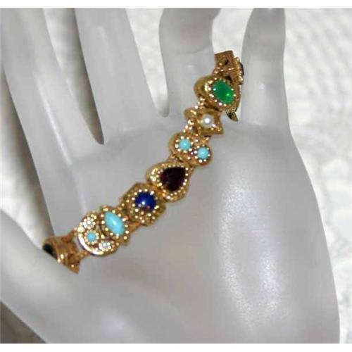 Produced in the 1950s by the Goldette Jewelry Company of New York, this is a gorgeous and unusual Slide Bracelet. Heavy gold plated metal with warm antique finish, seventeen slide stations each with a beautiful glass stone in various sizes, shapes and colors. Appears to have never been worn; one of the nicest Goldette Bracelets I have seen to date! Measuring 7 inches long by just under ½ inch wide. Securing with a fold-over clasp and safety chain! Signed Goldette NY with copyright mark.