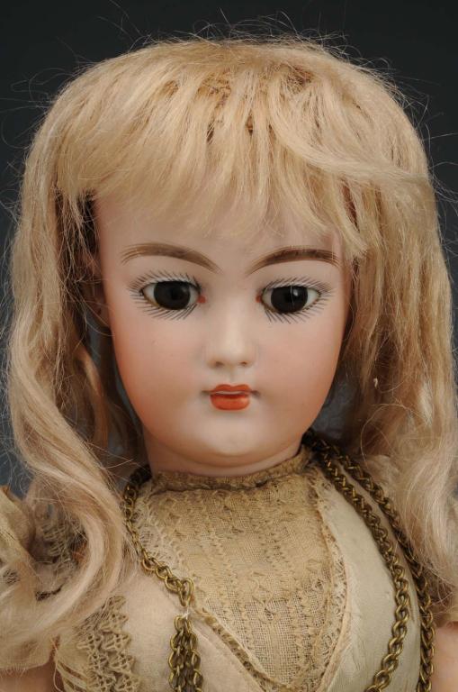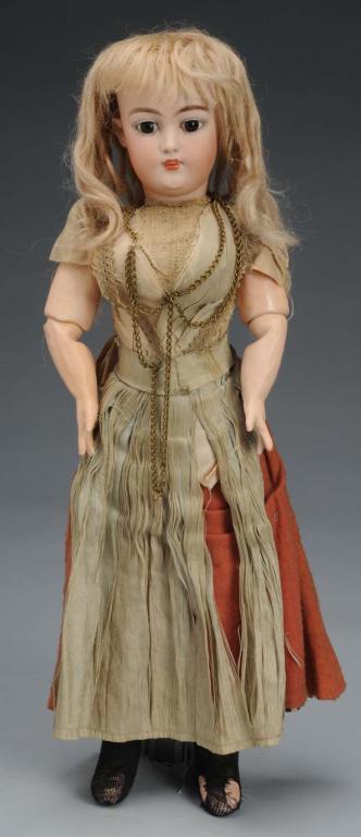 Description Head incised "1159 S&H DEP7". Brown glass stationary eye in original setting, rare open/close mouth, dimple in chin, and original La-Patricienne-style French lady body with narrow waist, molded bosom, and jointed at the shoulders, elbows, and hips with long slender fingers and straight wrists. Wears a replaced wig and remnants of an original ethnic costume with flannel skirt, green silk blouse, apron, and chain decoration. Condition (Excellent). Size 20" T.