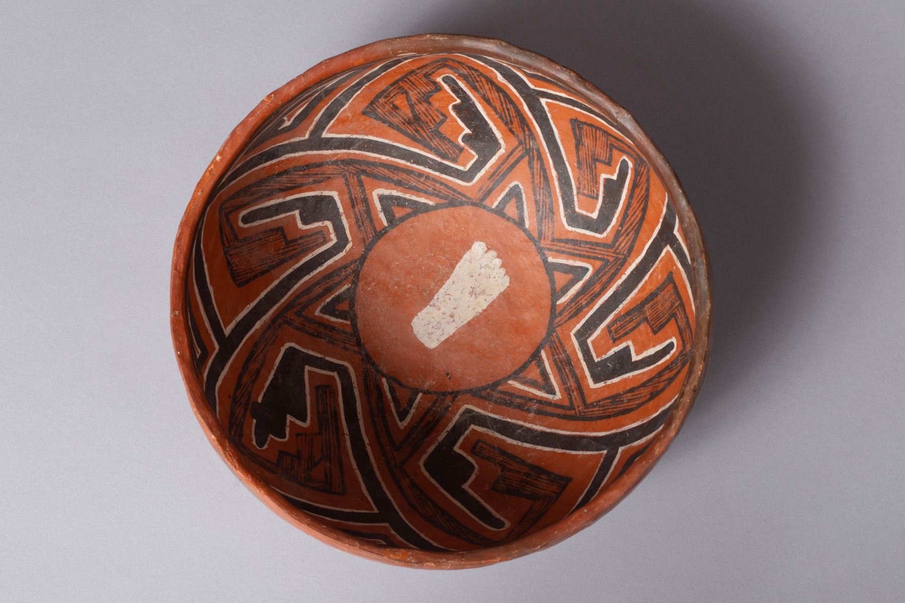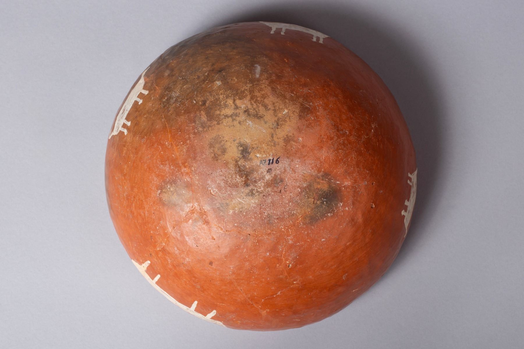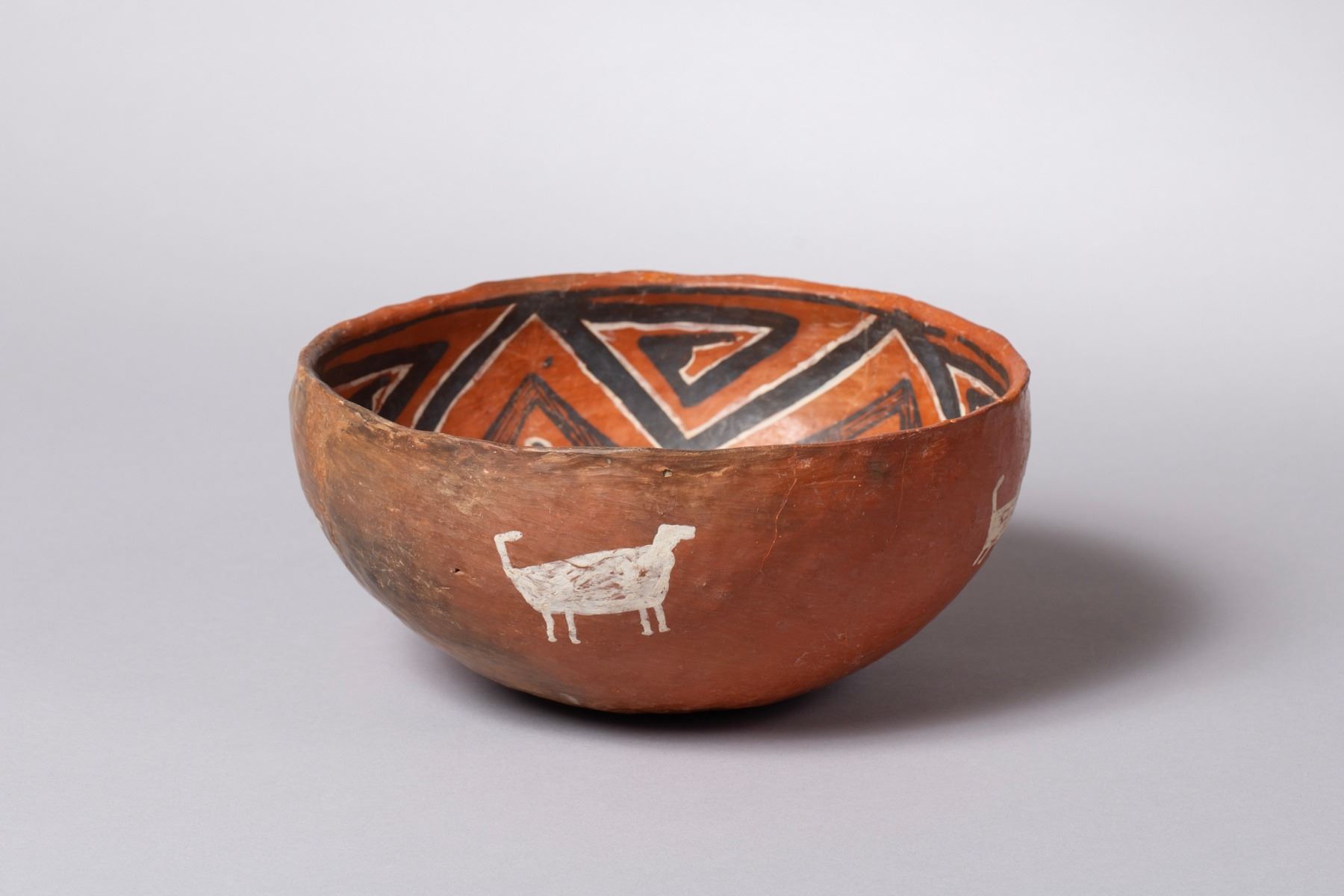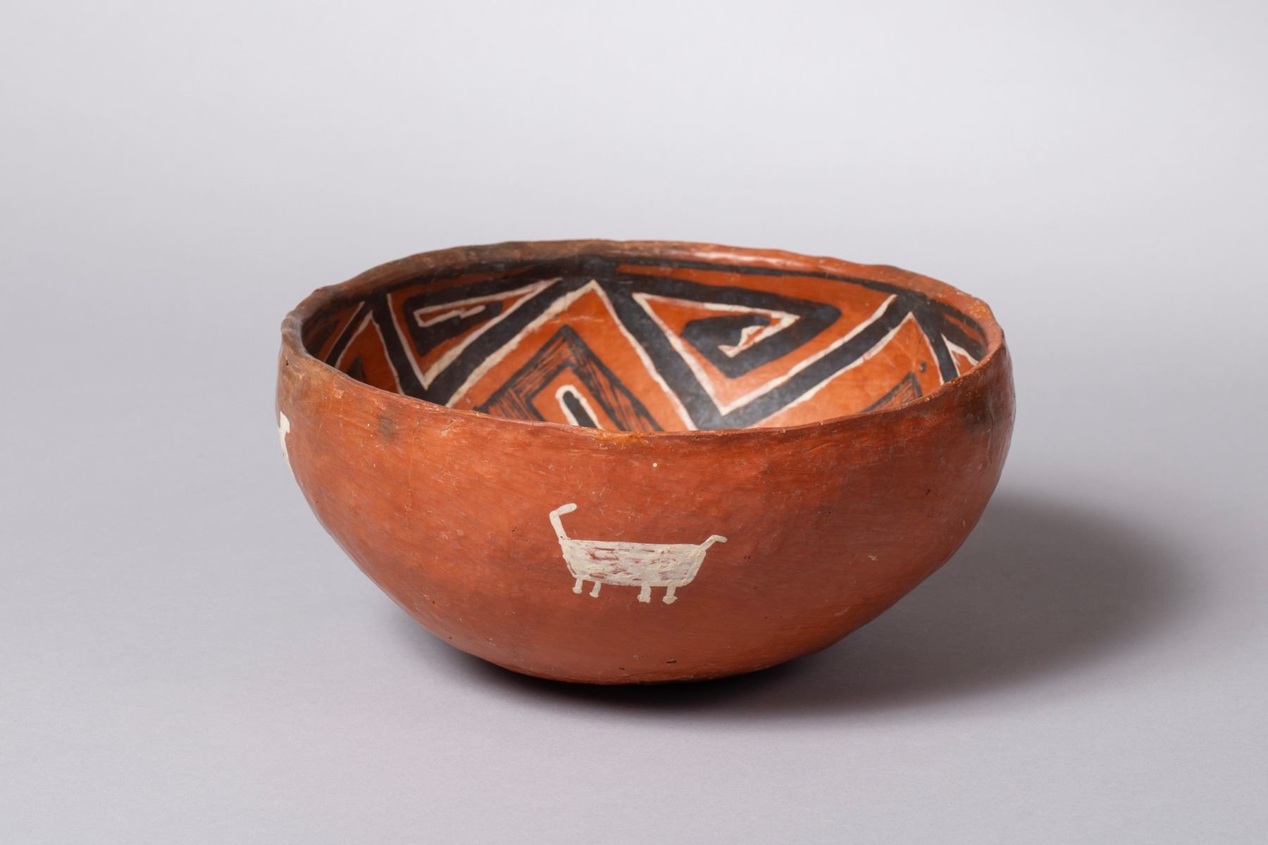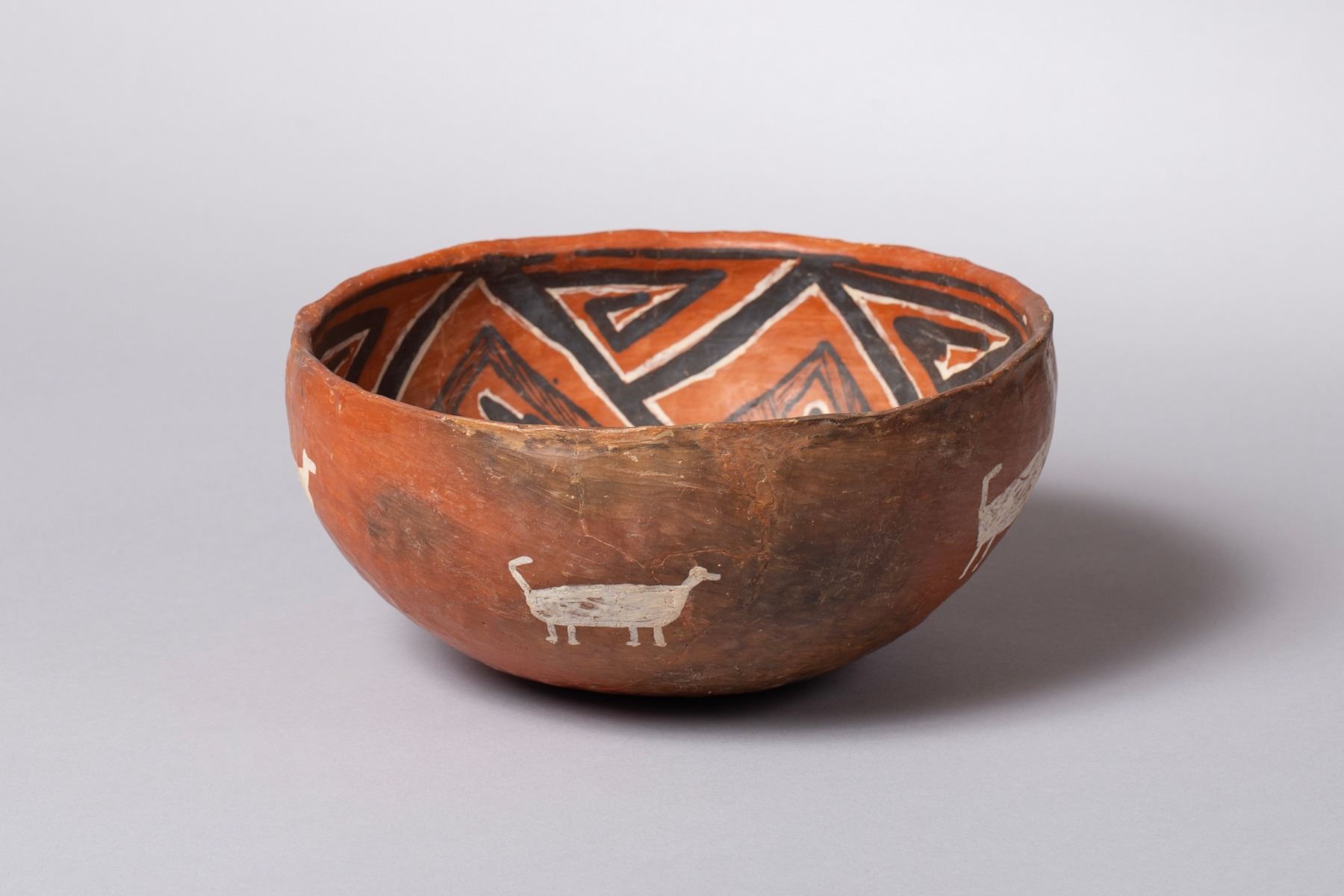 Polychrome redware bowl featuring black and white interior designs, with a white foot at the center. Exterior depicts four white animals encircling the bowl.