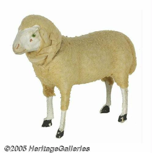 <B>Unusual Standing Lamb Candy Container</B></I> The container presents with the original paint. The head fits nicely into the body and from the paint on his feet it does not appear he was ever on a stand. Displaying nicely with only minor wear due to aging of the fabric making up his body. Original bow around his neck, the lamb stands 5 1/2" tall. Lot:252