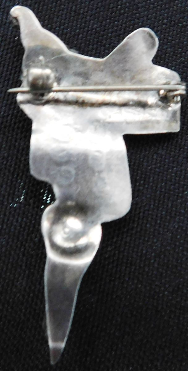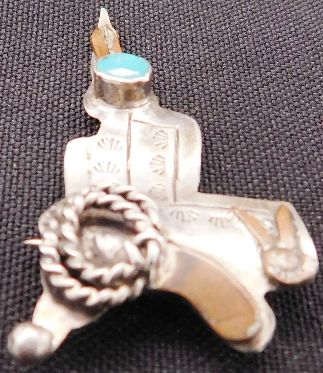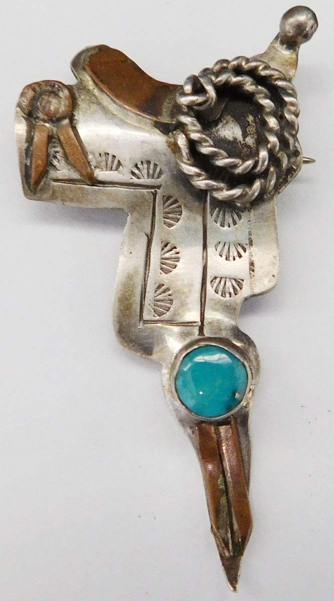 Unusual Sterling Silver & Turquoise Saddle Pin, circa 1940's, made of sterling silver and turquoise with possible brass overlay. This pin measures 2" x 1" with a hand-stamped design. This pin is in the shape of a wrangler's saddle including a coiled rope and other details. The weight is approx. 5 grams. Condition: Worn, nice patina, see images. Shipping: $14.50