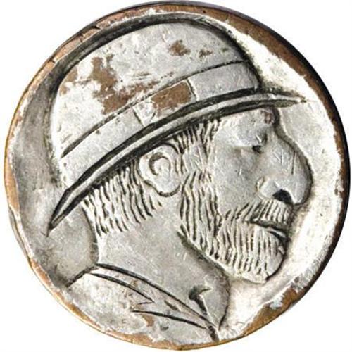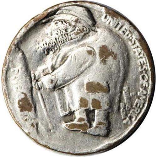 <B>Unusual Two-Sided, Put-Together Hobo Nickel.</B></I> This is an unusual piece because it is not carved on a host coin, but instead is a "put-together piece" from two cast pieces, a carved obverse and a carved reverse (note the seam on the edge). The obverse is of the typical subject, a bearded man wearing a hat, and the reverse depicts a walking humpbacked man with a cane. Also note that the obverse and reverse do not line up in a coin alignment and that the base metal of the piece is showing through on the reverse design. this would grade high Average, and while contemporary, is not considered "original."<BR><BR><BR><b>Shipping:</b> Coins & Currency (<a target="_blank" href="http://www.heritageauctions.com/common/shipping.php">view shipping information</a>)