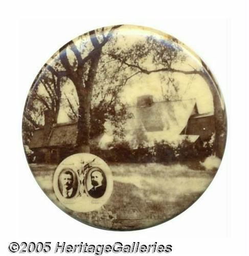 <B>Unusual, Uniquely-designed 1904 Theodore Roosevelt - Charles W. Fairbanks Jugate Button</B></I> This rich sepia 1 1/4" button features a large image of Roosevelt's personal residence, with a tiny inset jugate at 7:00 (the inset is actually itself a reduction of a jugate button design found in several larger sizes). This button is usually seen somewhat imperfect, but this is a gem; even the Baltimore Badge back paper is "minty." Lot:261