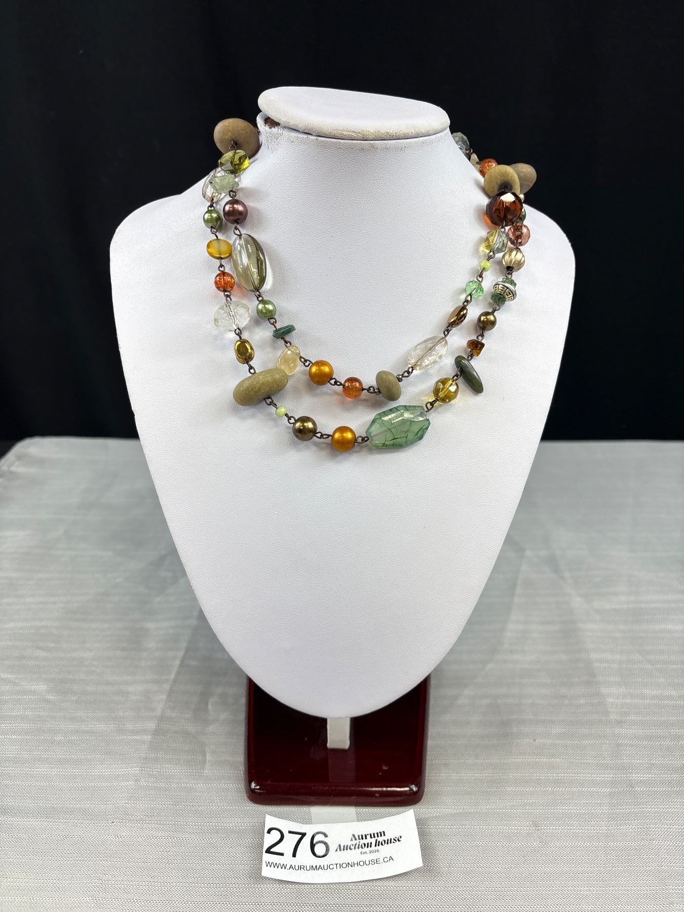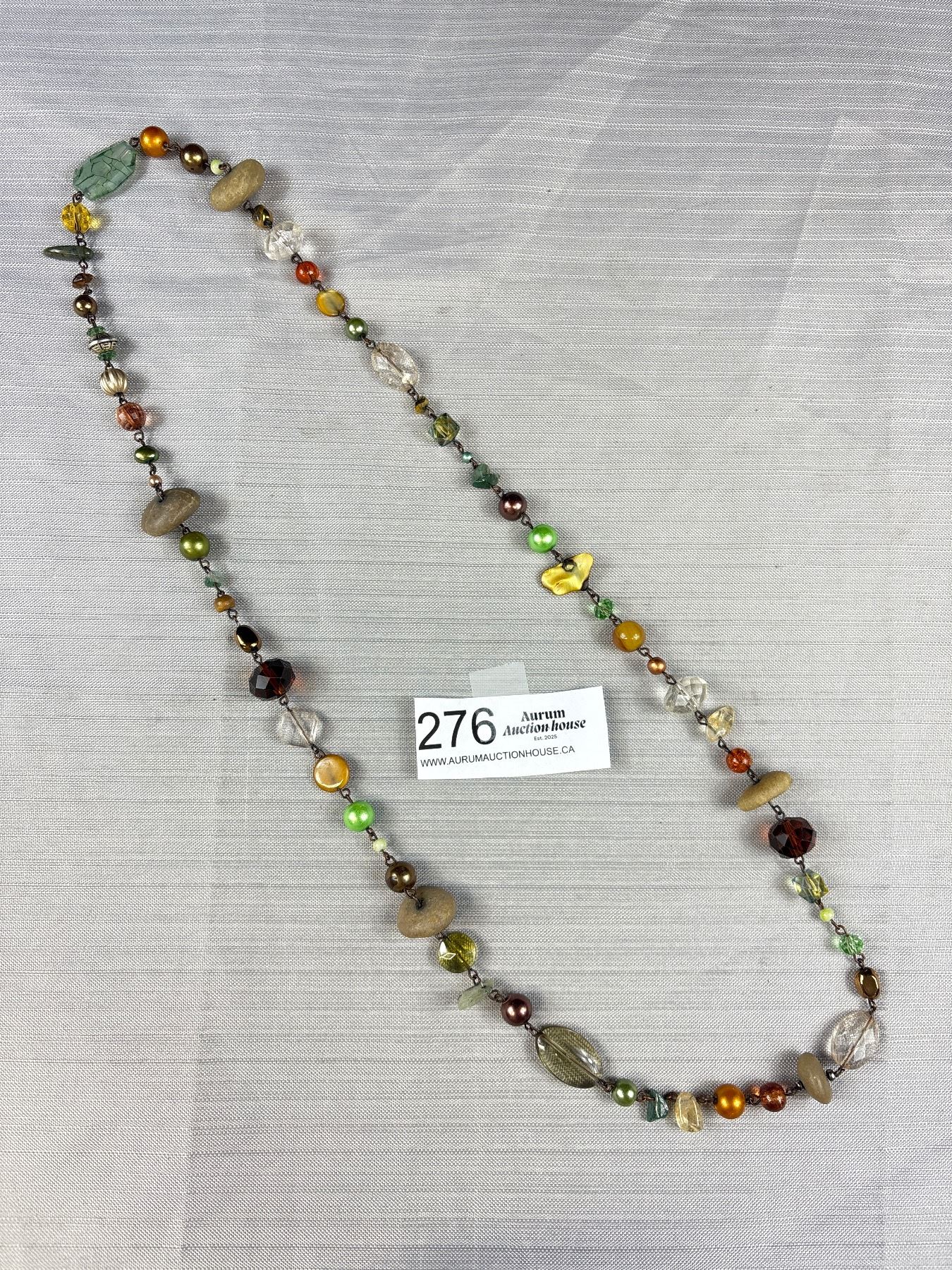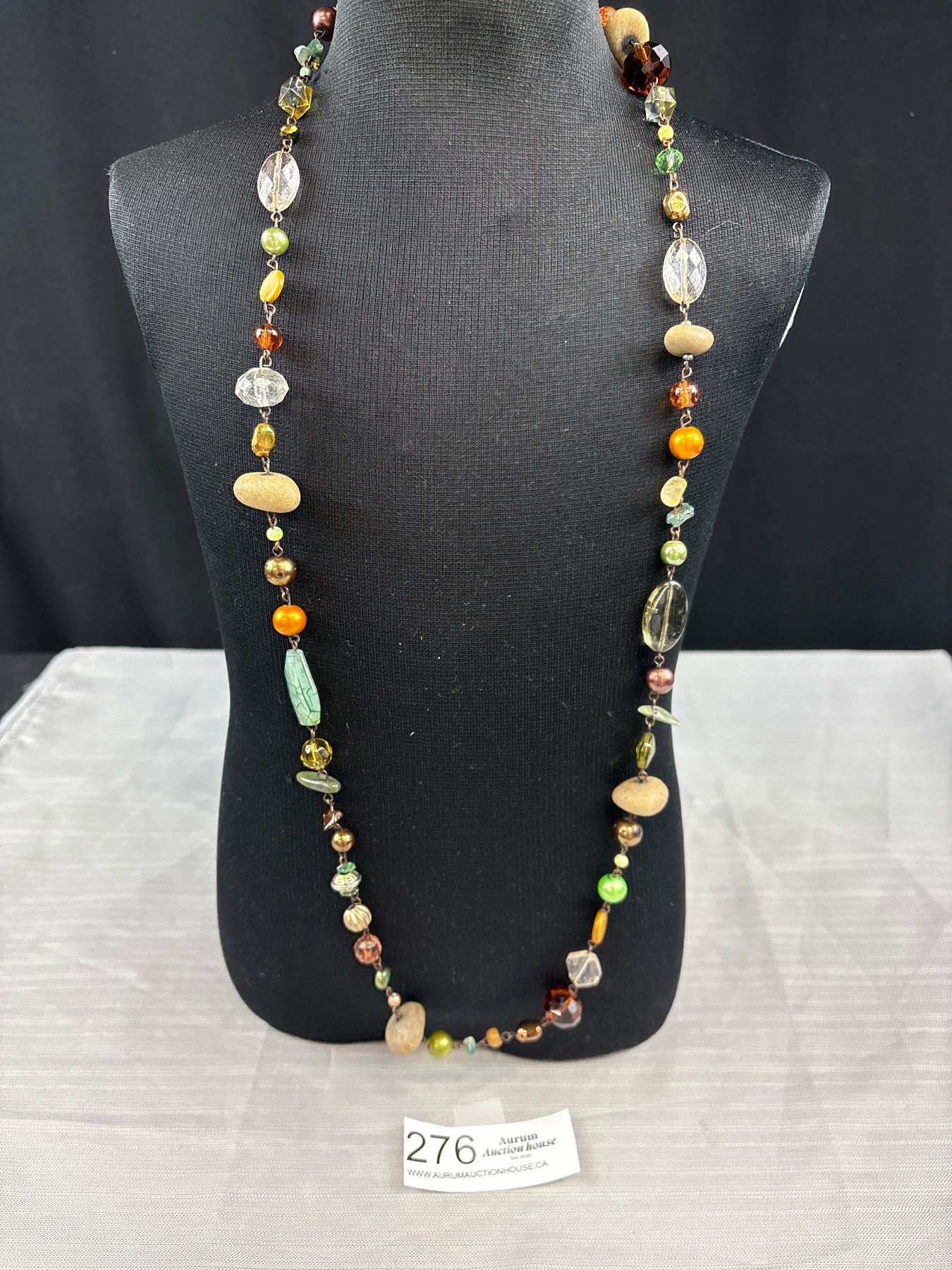 Unusual Vintage Metal Chain Connection w/ Semi Precious Stone + Crystal Beads Necklace, Extra Length, 35"