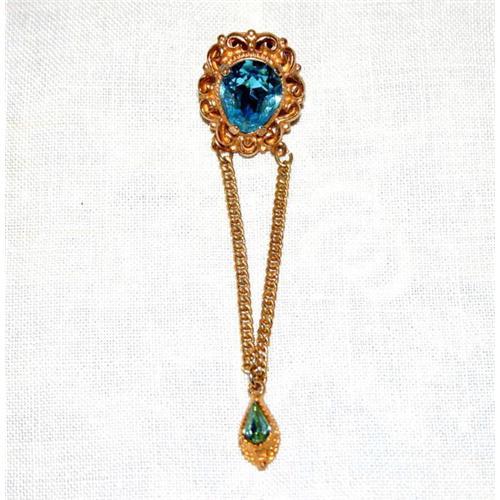 The attention grabber is what this vintage 1950s Pin should be called with the huge multi-faceted, oval shaped light blue colored Rhinestone center, prong set in a fancy gold plated metal frame. Suspended by a chain is a gorgeous Bezel set Tear Drop shaped light blue colored Rhinestone. The large center Rhinestone itself measures 1 inch long with the overall length of this Pin or Brooch measuring 3 inches long, securing at the top of the Brooch with a stick pin closure. Gorgeous, fun and fabulous!
