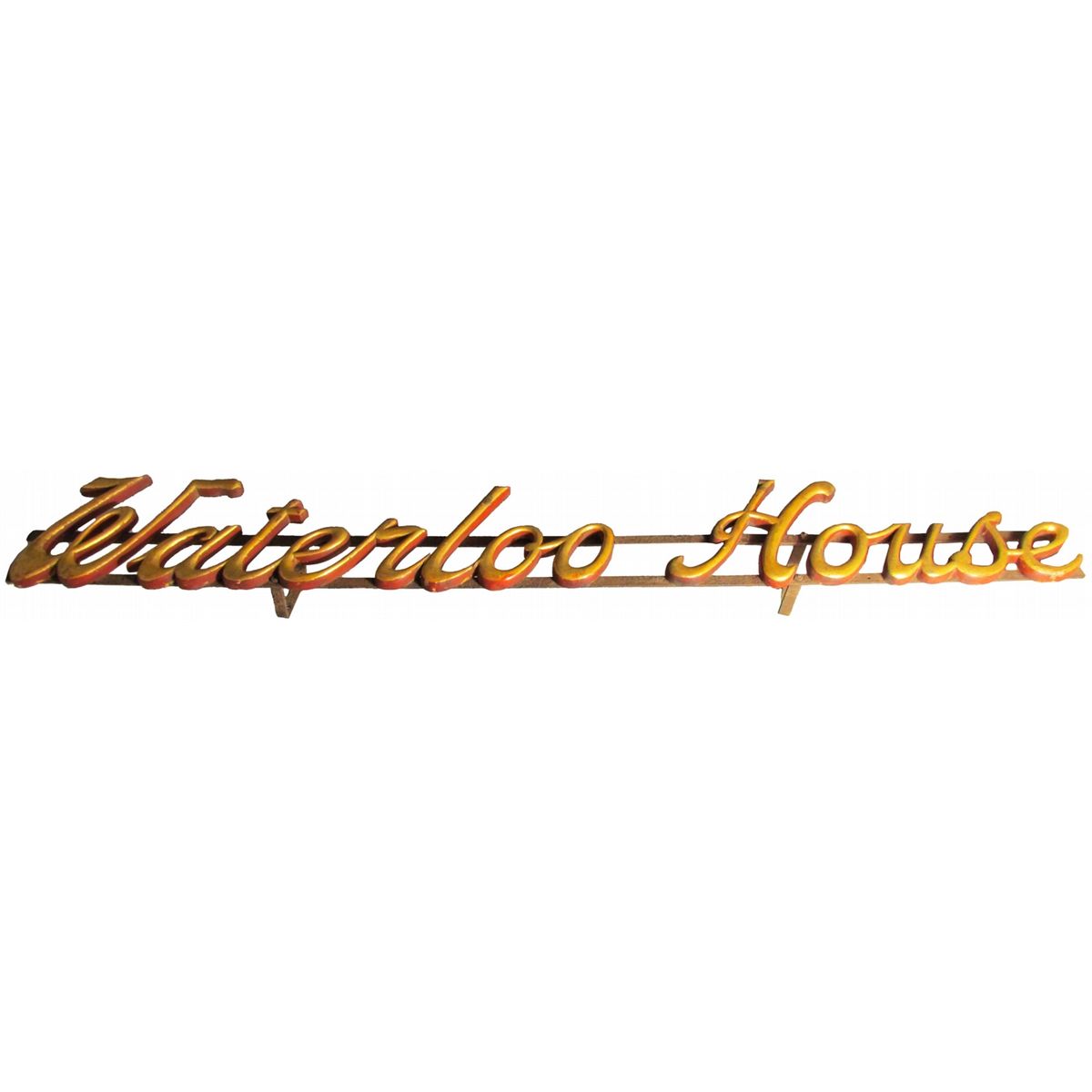 Unusual "Waterloo House" Wood Sign. Script wood raised letters mounted on iron bracket. Excellent original condition. 64 X 8 1/2 X 1 1/2 inches.