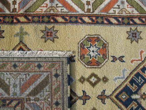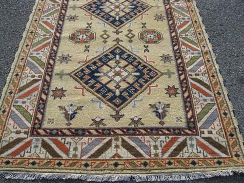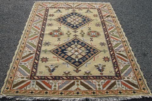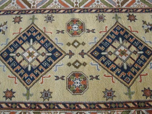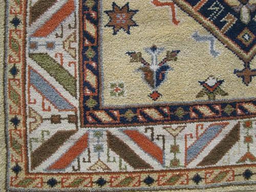 Lovely Exotic Design Handmade Fine Shirvan-Kazak Rug. 100% Natural, vegetable dye, hand woven, hand spun, worsted wool pile, on cotton foundation. This is a charming Shriven Kazak geometric design with its double medallion of navy blue over a lovely champagne color background. The stylized broken leaves and wine glass in the main primary border, add to the charm of this intriguing piece. Please notice the stylized running dogs inside the central medallions in this captivating piece. The art of Rug weaving in the Karabak, Shiravan territory is undoubtedly influenced by a number of objective factors, among them the geographical location of this region, at the joint of the east and the west. here, along the greater Caucasus ridge, lies the borderline between Asia and Europe. Here is the historical juxtaposition point between Islamic and Christian cultures. Many long caravans passed through this territory over the centuries up until the middle of 20th century. Charming and happy colors are one of the characteristic of Shirvan Rugs. Size: 7 feet X 4 feet 6 inches. Country of Origin: Karabak.