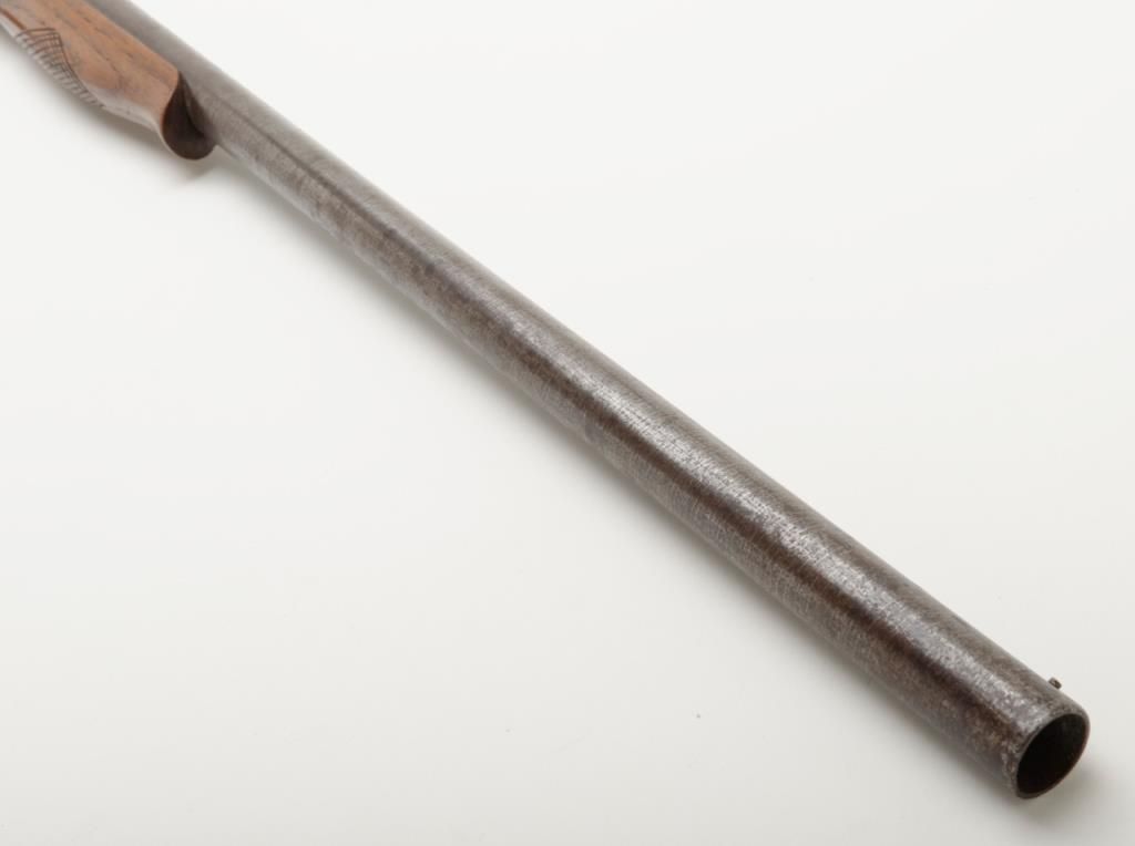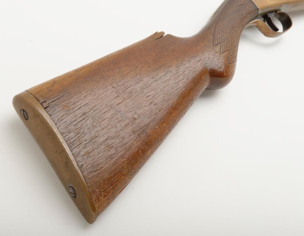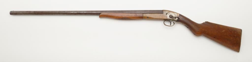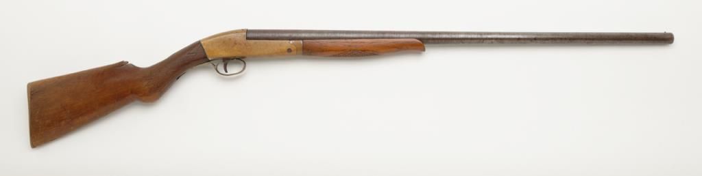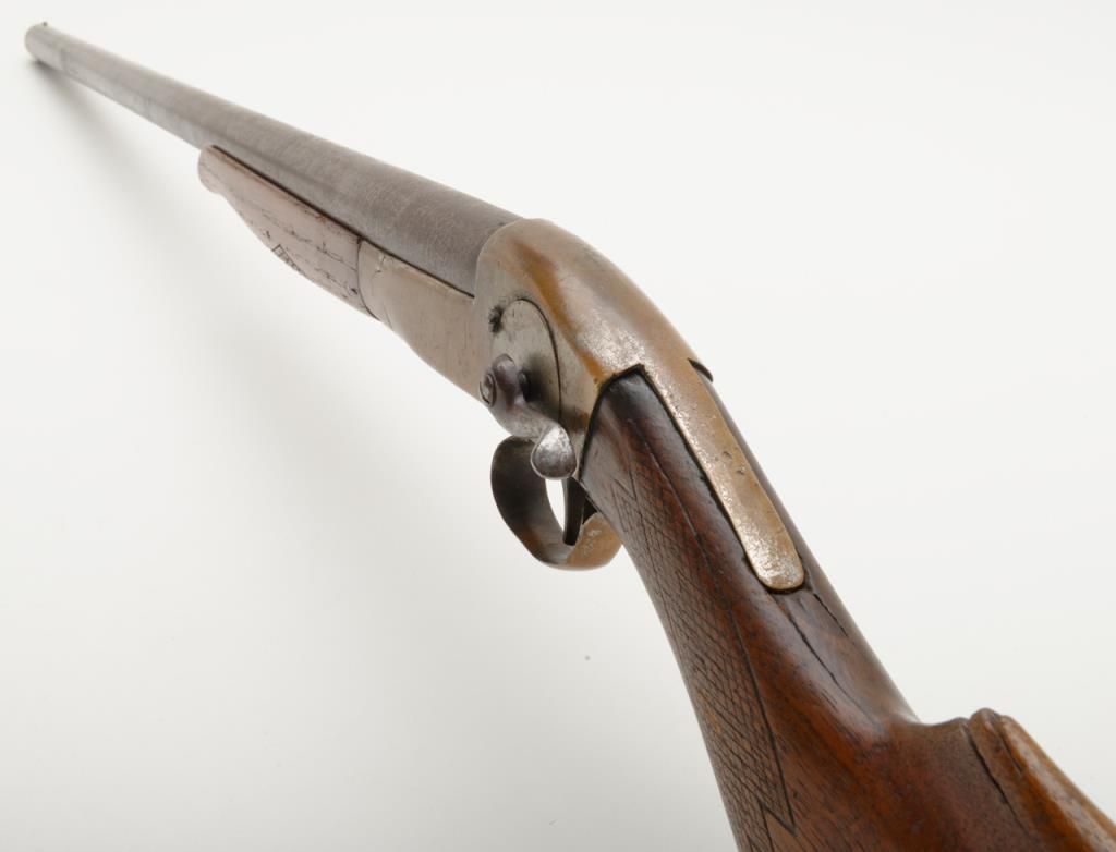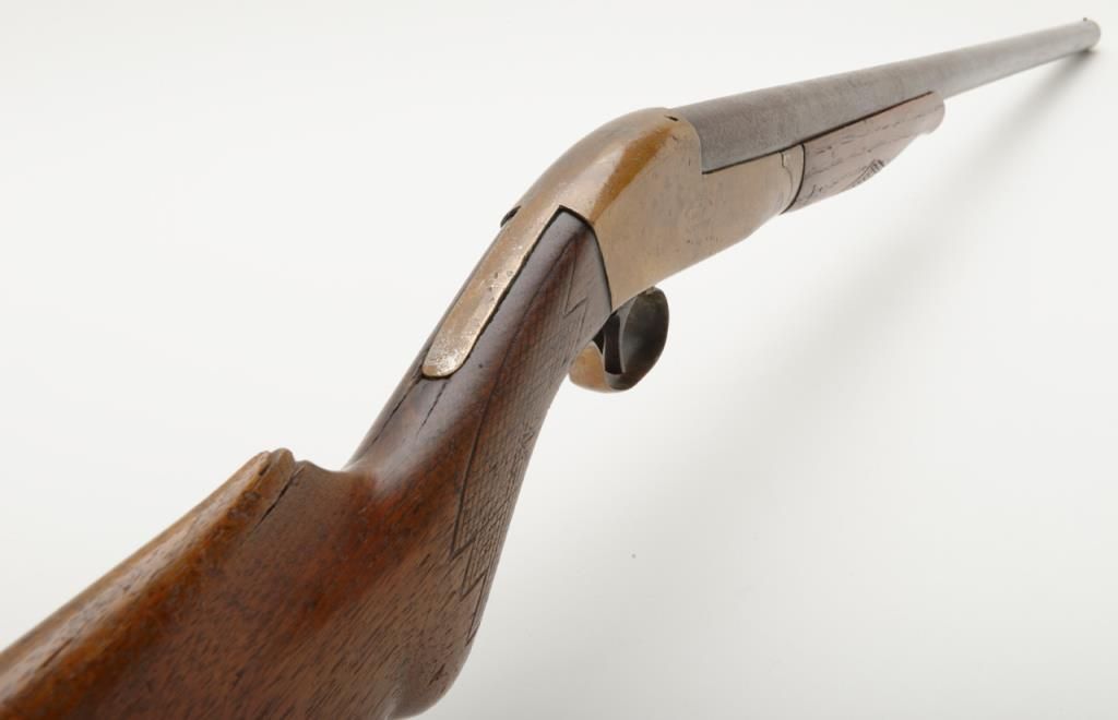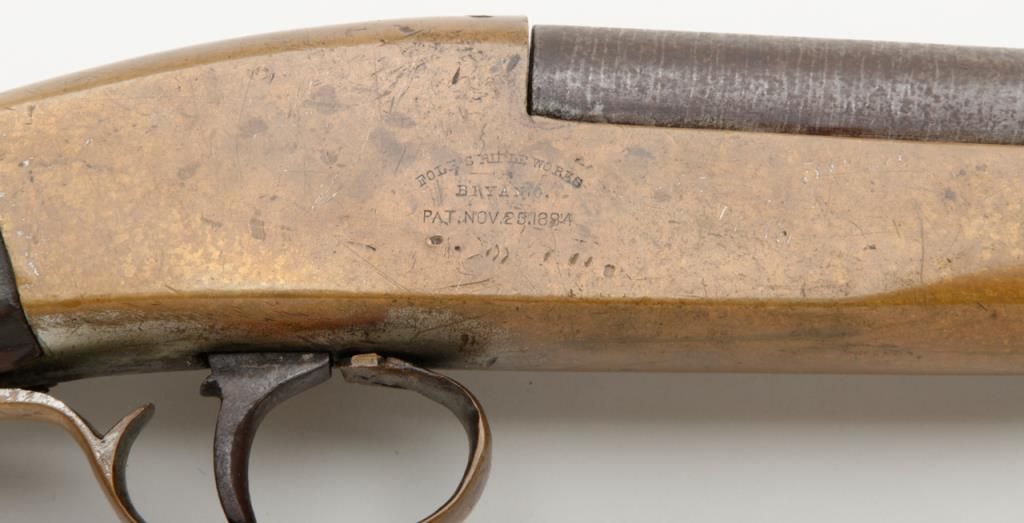 Unusual brass frame side cocking single shot shotgun marked “Folk’s Rifle Works, Pat Nov 25, 1884” with 31” barrel, 12 gauge, Damascus twist barrel. The shotgun remains in good condition with some minor damage and loss to the stock but generally very good overall. We have never seen another and can find no location on Folk’s. Est.: $150-$300