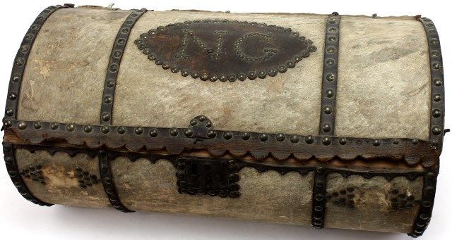 leather bound and tacked with initials NG on top, iron handles left and right side, 12" X 23" showing very good condition. Est. 400-650