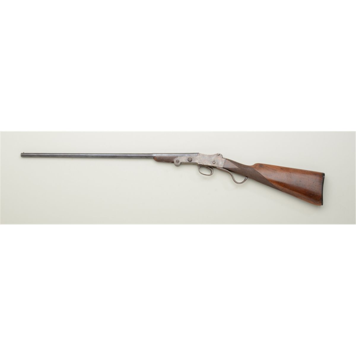 Unusual falling block single shot shotgun, similar to Martini-Henry design, in .410 gauge by Delhoune of Belgium. The barrel is hinged so that the shotgun folds in two. The gun shows 50-70% blue in case hardening,with very good checkered stocks. Fancy butt plate shows a chip. Generally very good overall. Chamber is very short. 37" overall, 22" barrel, lightweight. We have never seen another in 42 years of sellingantique arms. Estimate: $300 - $600