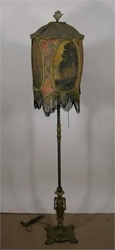 Unusual floor lamp with iron base and early cloth and beaded 4 sided shade, 63 inches tall. Good Condition.
