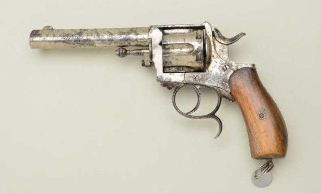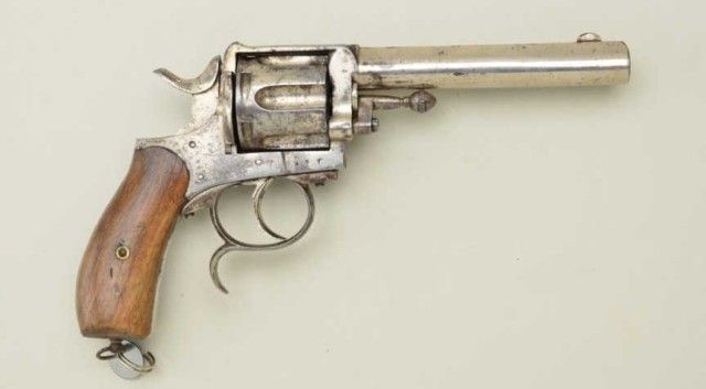 Unusual large frame DA Belgian Bull Dog type DA revolver marked “FRONTIER BULLDOG” on the top strap, .41 cal., 5-1/4” barrel, nickel finish, smooth wood grips, #497. This gun is in overall good condition showing scatteredareas of original nickel finish with intermittent spots of erosion and light pitting; dark bore, good action, sharp markings, small lanyard ring, good grips with a couple old mars from storage; similar inprofile to the Smith & Wesson First Model DA top break .44 revolver. Est.: $400-$800.