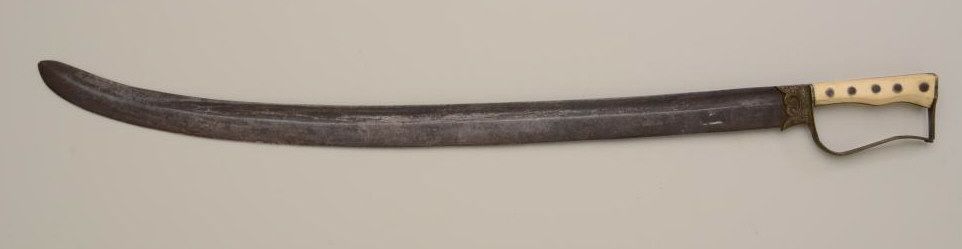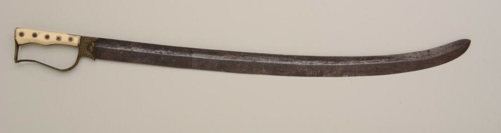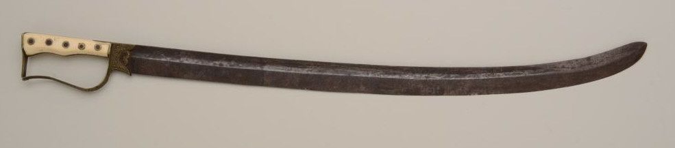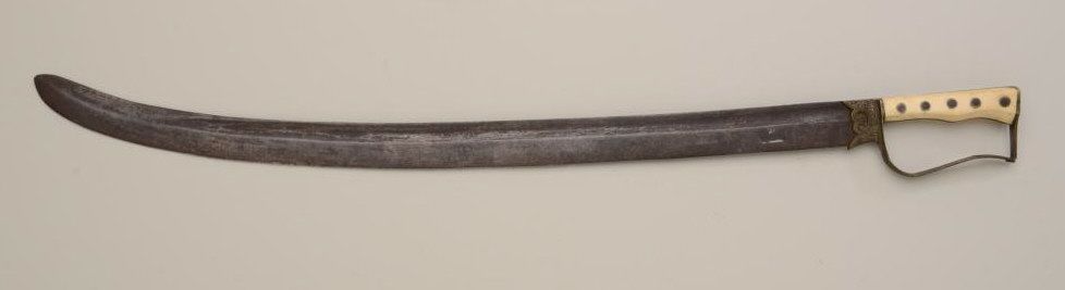 Unusual small saber from Balkans to Greece; the sword measures 27" with 23" blade, the grip is of marine ivory, the D-shaped guard is lightly engraved. The blade shows a pronounced curve towards the last 6", and the blade measures 1-1/4" across widest portion. The right side of the blade shows a "VL" and 21844. The condition is fair to good, small chip from the grip; blade shows a heavy patina with some moderate to light pitting. Seldom seen. Est.: $200-$400
