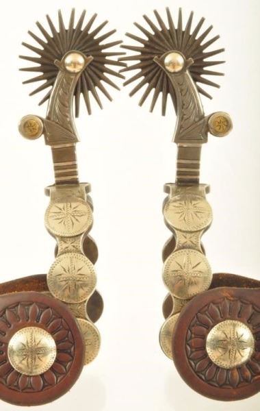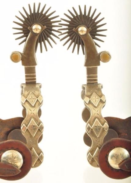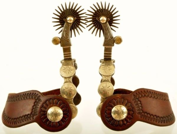 Marked L&M on shank close to rowel. Fitted with Buddie Foster marked border stamped straps