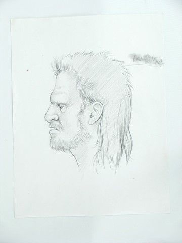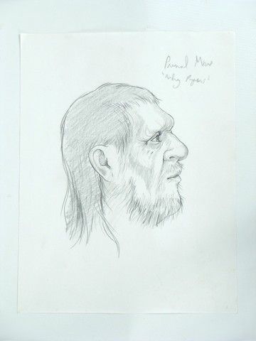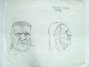 From the critically acclaimed but ill-fated Wolper 1974 docu-drama "Up From The Ape" (aka: "Primal Man" and "The Ardrey Papers"), these are three original pencil sketches of the "primitive man" for special make up effects. The series used exotic locations and actors to faithfully recreated our primal ancestors. Sadly, many of the cast and crew were killed on a plane flight to one of the locations near the end of shooting. (Drawings are on artist paper approx. 10"x11", and artist tissue sketch paper 14"x17" which has some boarder wrinkling).