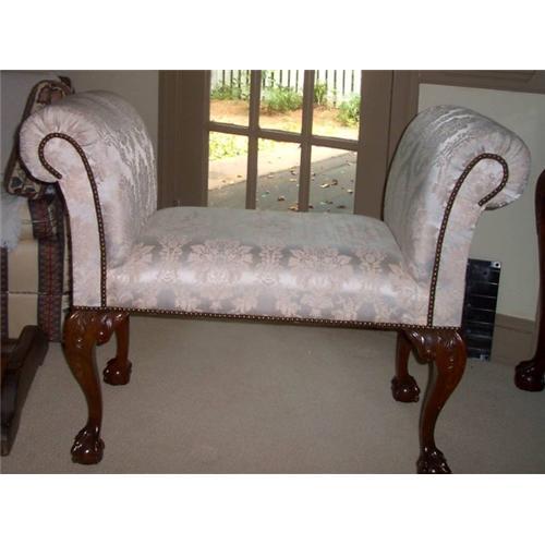 This beautiful white on white brocade chippendale bench is exquisite. It was designed for a client by a local designer and did not fit into the scheme. Make this your lovely addition to bedroom, bath, or living space. It measures 41"long. The arm is 30" high. The seating is 19-20" high and it is 18" wide at the widest point. The legs are mahogany chippendale ball and claw. A beautiful designer find.