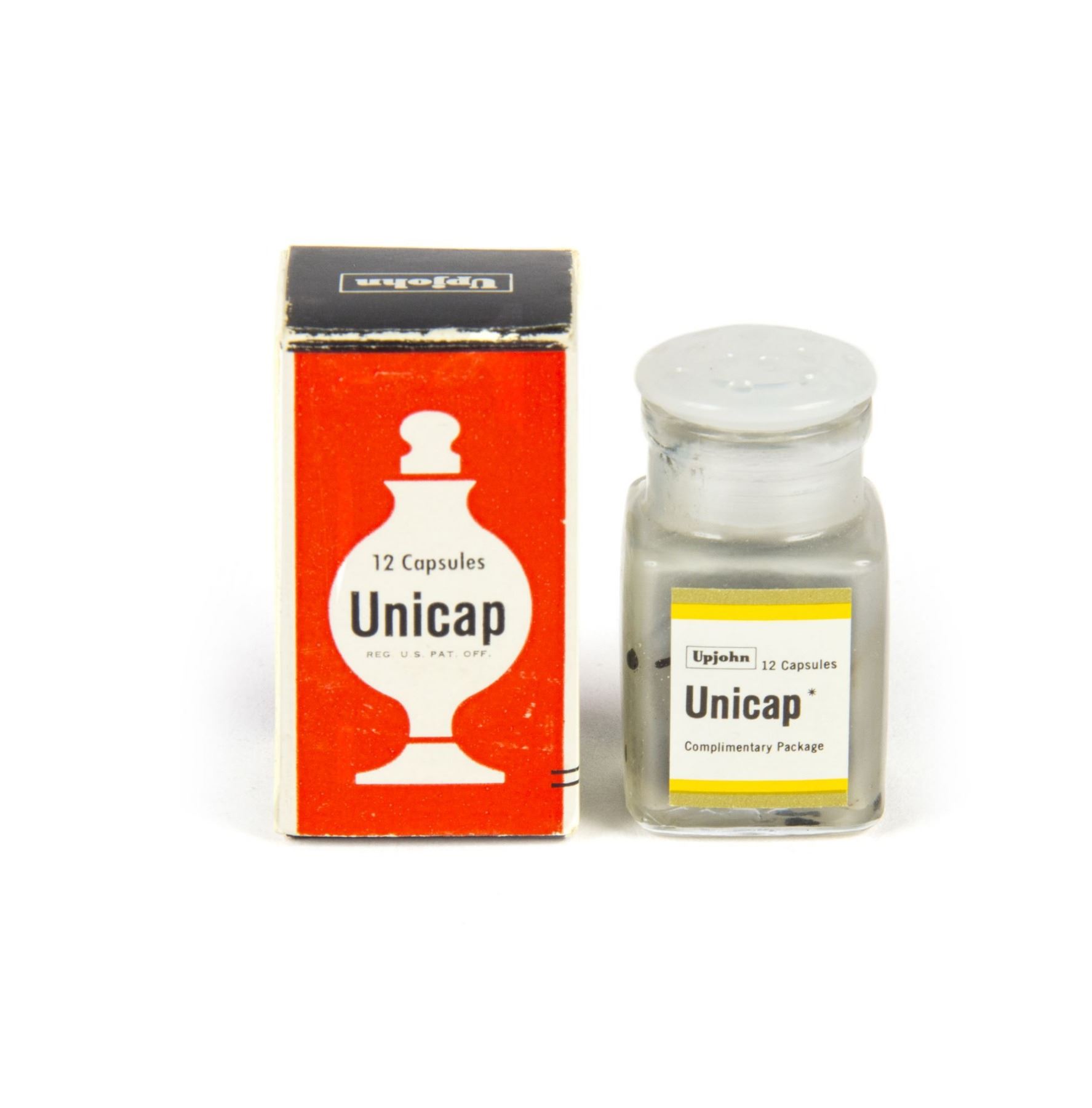 (Disneyland, c.1955-60s) An original souvenir bottle of Unicap vitamins from Disneyland's "Upjohn Pharmacy" on Main Street. These souvenirs were provided free as a courtesy from Upjohn, and come unused in their original Disneyland box. Amazingly, these vitamins still retains the original paper informative sheet inside, which is typically missing. The box measures 1"x1" and 1.75" tall, and the condition is very good.