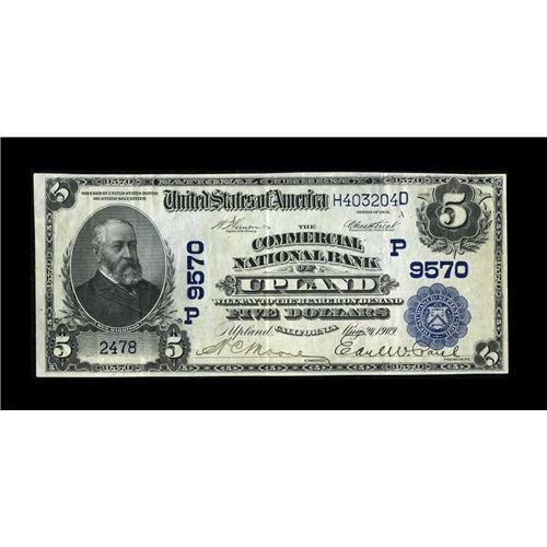 <B>Upland, CA</B></I> - $5 1902 Plain Back Fr. 600 <B>The Commercial NB</B></I> Ch. # (P)9570<BR>A wonderful new discovery from one of the rarest banks in southern California's San Bernardino County. This institution is by far the more difficult of Upland's two issuers to obtain, having issued large notes only before disappearing forever in 1927. The census lists just four examples, one Fair, one Very Good, and two Very Fine. We sold both of the Very Fine examples as part of the Colver collection in 1999, with one becoming part of the Horwedel holdings and the other crossing the auction block again in 2005, where it realized $7130, somewhat over twice what it realized back in 1999. This piece is new to the census, and comes to us from a long time collector who obtained it many years ago from the family of W.C. Moore, who signs here as Cashier. While there are a few storage folds, this <B>Extremely Fine</B></I> note is as bright and crackling fresh as the day it was cut from the sheet, with incredible color and bright white paper. If rarity and desirability are any guide here, expect this California trophy item to easily reach and quite likely exceed...<BR><BR><b>Shipping:</b> Coin/Currency (<a target="_blank" href="http://www.heritageauctions.com/common/shipping.php">view shipping information</a>)