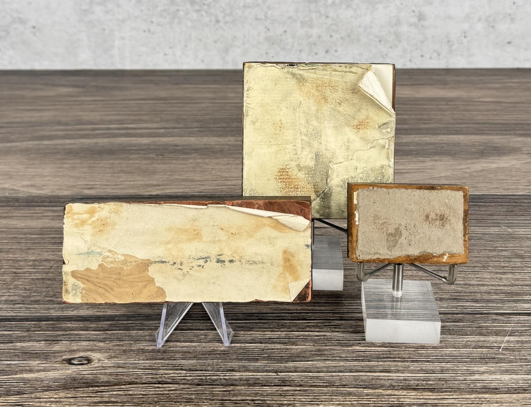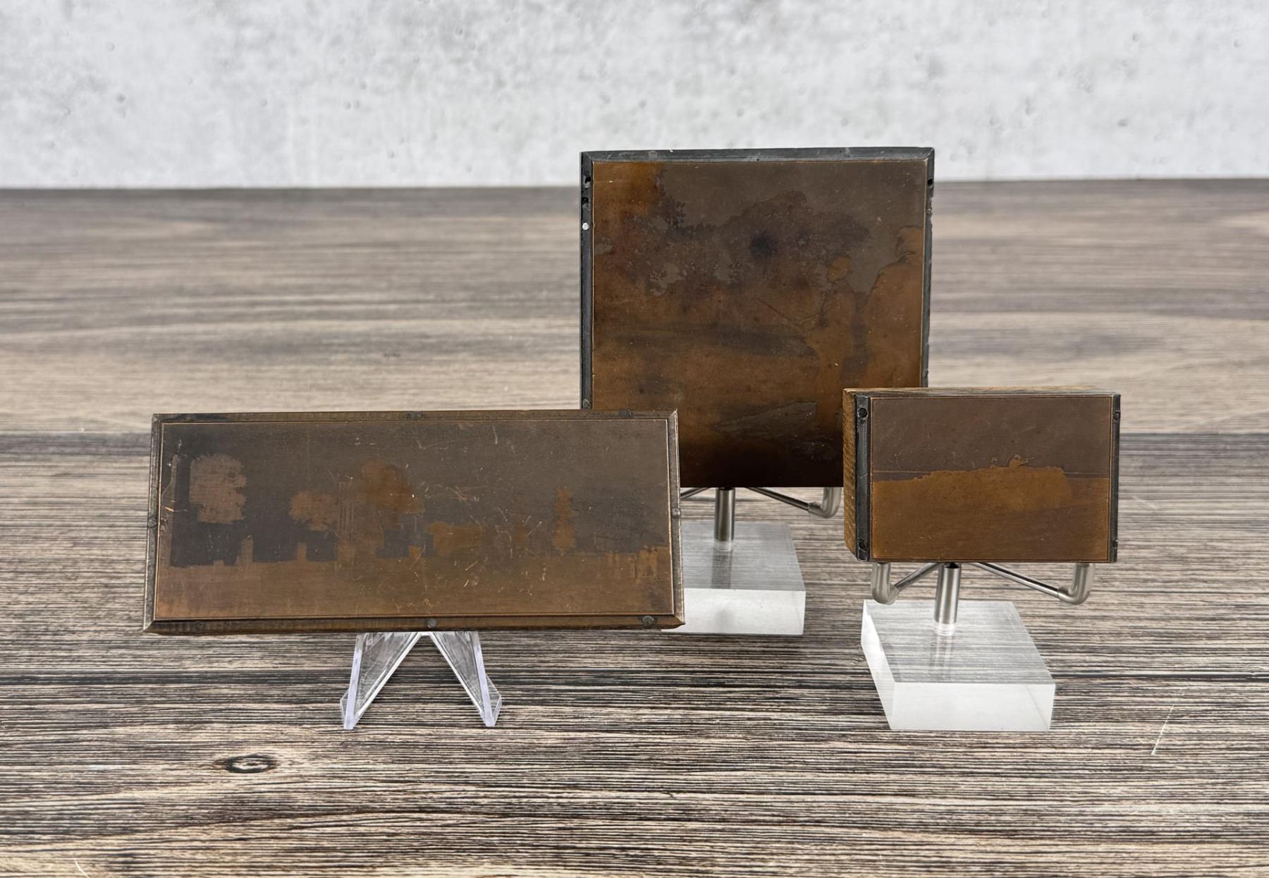 Nice grouping. Largest is 5" long by 3 3/4" tall. Smallest plate is 2 1/2'' long by 2 1/4".