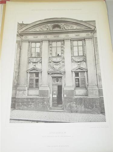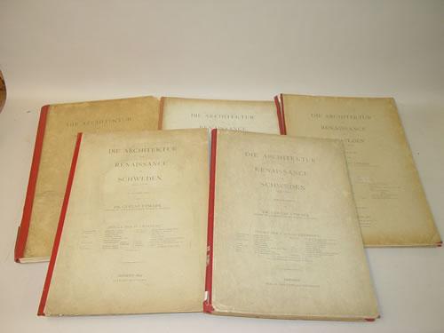 Upmark, Dr. Gustaf. Die Architektur Der Renaissance in Schweden (1530-1760) in 5 Portfolios. Elephant Folio - over 15" - 23" tall. Hard Cover. Ex-Library. Good Condition. SWEDISH ARCHITECTURE. 1897-1899. Half-title, title, List of Plates, 132pp German text, and 100 b/w collotype photographic plates on hard stock, in 5 original portfolios ( a few of the plates are line drawings). First two volumes: published by Schuster & Bufleb in Berlin, last three published by Gerhard Kuhtmann in Dresden. Volume Two has backstrip split.