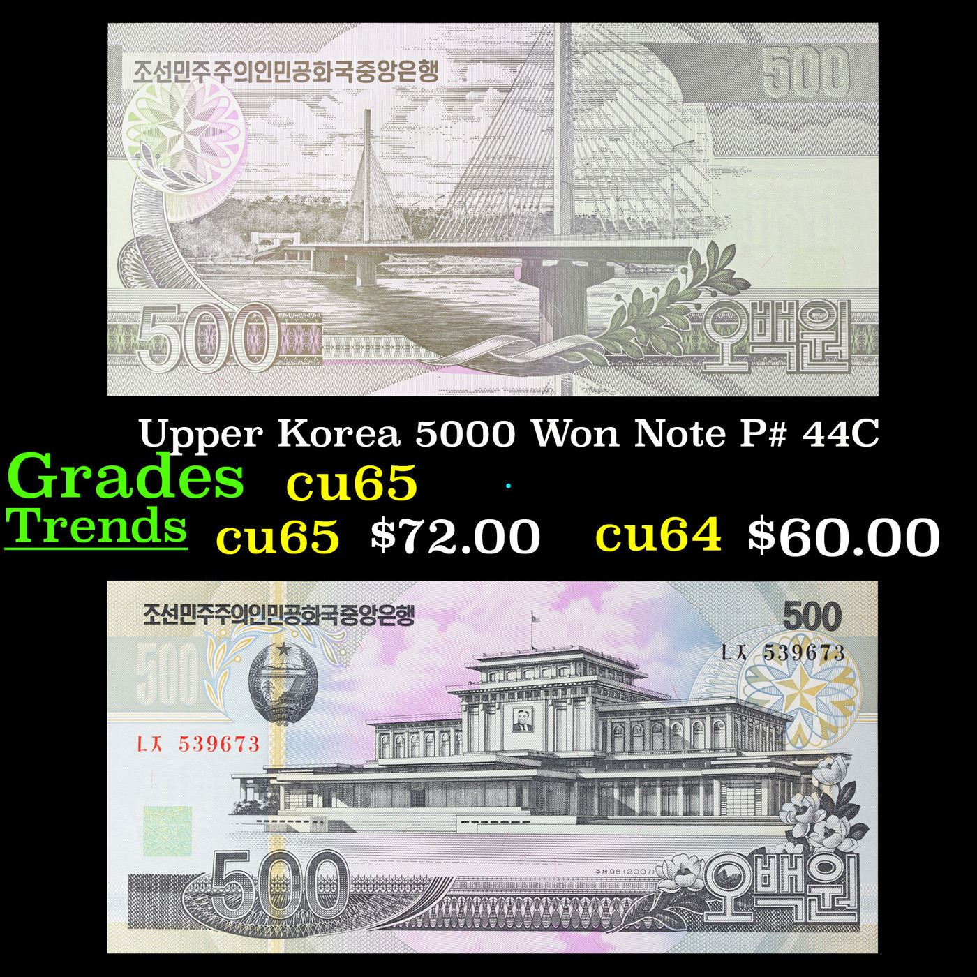 Upper Korea 5000 Won Note P# 44C Grades Gem CU.