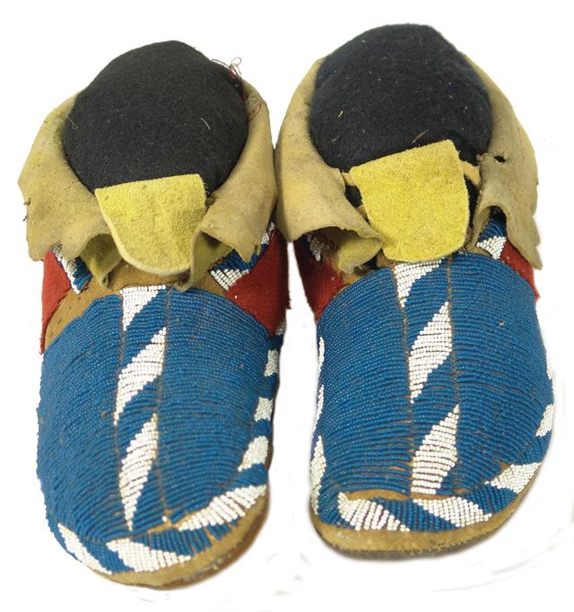 Circa 1850s, Rare, early, fully beaded two color moccasins, the simple barber pole design sinew sewn in pony trader blue and white on yellow ochred buffalo calf, with red Stroud insets on sides; museum quality. 10"