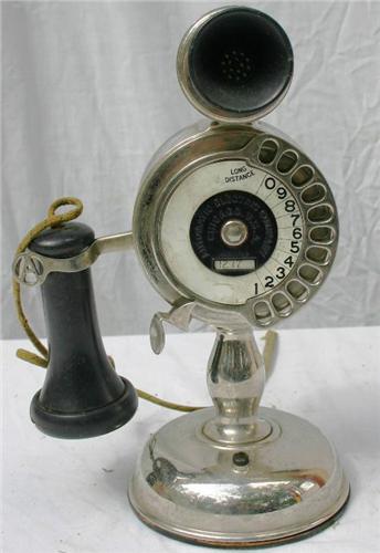 Upright phone with rotary dial in front. Adjustable mouthpiece. Chrome. Automatic Electric Co., Chicago, USA. Base approx. 5 ½" diameter. Approximately 12" H. Excellent original condition.