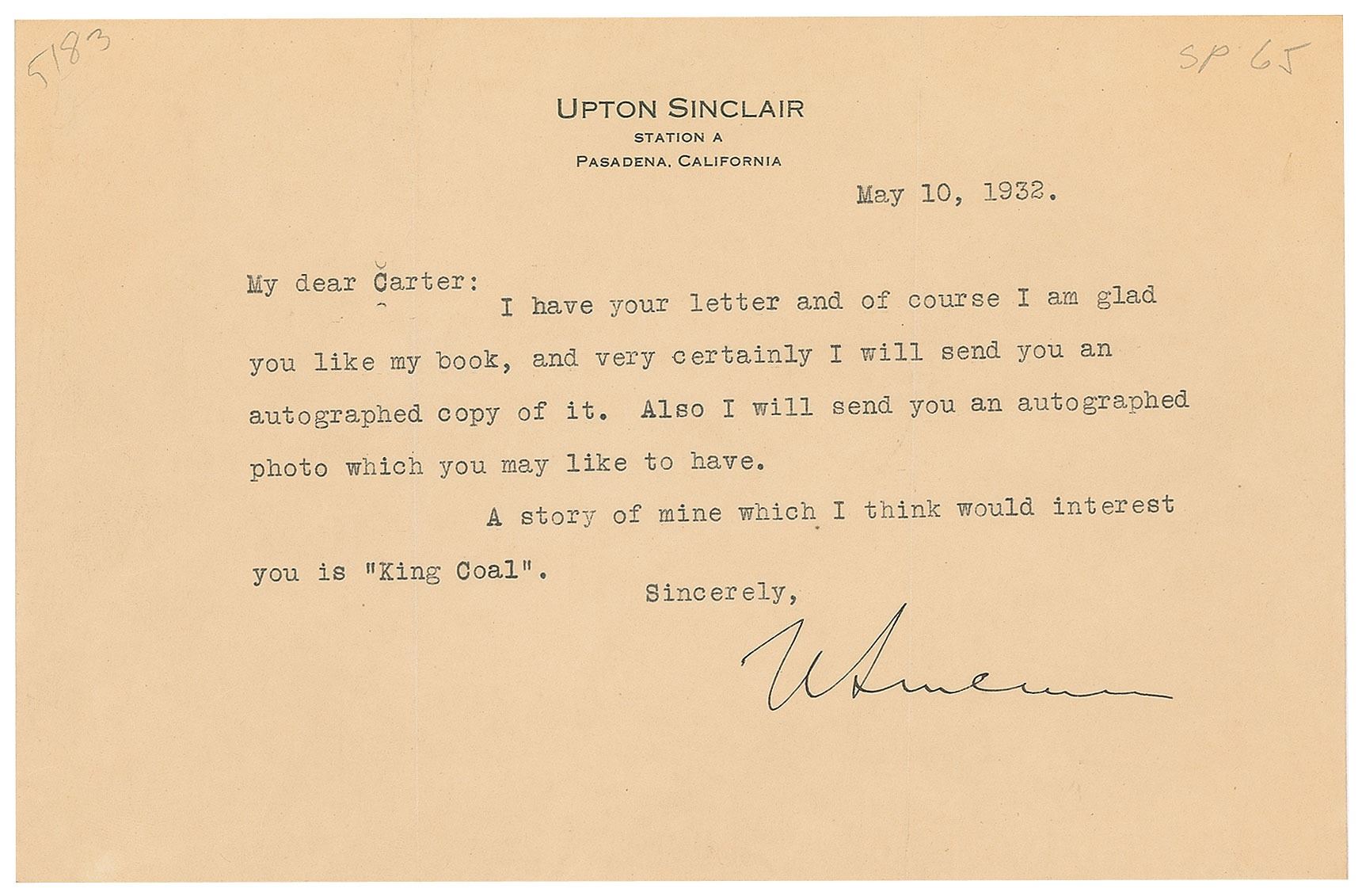 TLS signed “U. Sinclair,” one page, 8.5 x 5.5, personal letterhead, May 10, 1932. Letter to "My dear Carter," in full: "I have your letter and of course I am glad you like my book, and very certainly I will send you an autographed copy of it. Also I will send you an autographed photo which you may like to have. A story of mine which I think would interest you is 'King Coal.'" In fine condition. Based on the 1913-1914 Colorado coal strikes, Sinclair's 1917 novel King Coal describes the poor working conditions in the coal mining industry in the western United States during the 1910s.