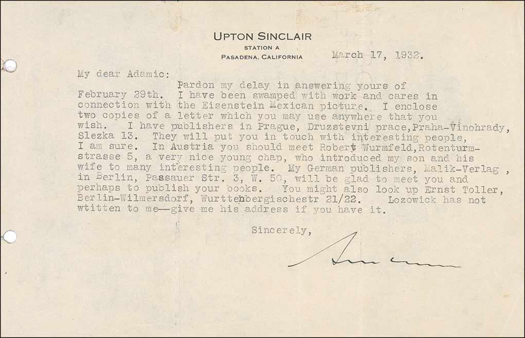 Influential Pulitzer Prize–winning American author (1878–1968) of such muckraking classics as The Jungle, Boston, and Oil!, the last of which served as the basis for the acclaimed 2007 film There Will Be Blood. TLS signed “Sinclair,” one page, 8.5 x 5.5, personal letterhead, March 17, 1932. Letter to writer and journalist Louis Adamic. In part: “I have been swamped with work and cares in connection with the Eisenstein Mexican picture. I enclose two copies of a letter which you may use anywhere that you wish. I have publishers in Prague…They will put you in touch with interesting people I am sure. In Austria you should meet Robert Wurmfeld…a very nice young chap, who introduced my son and his wife to many interesting people. My German publishers…will be glad to meet you and perhaps to publish your books.” Letter is affixed to a slightly larger black sheet. Three vertical folds, one through a single letter of signature, punch holes to left edge, and a bit of scattered light toning, otherwise fine condition.