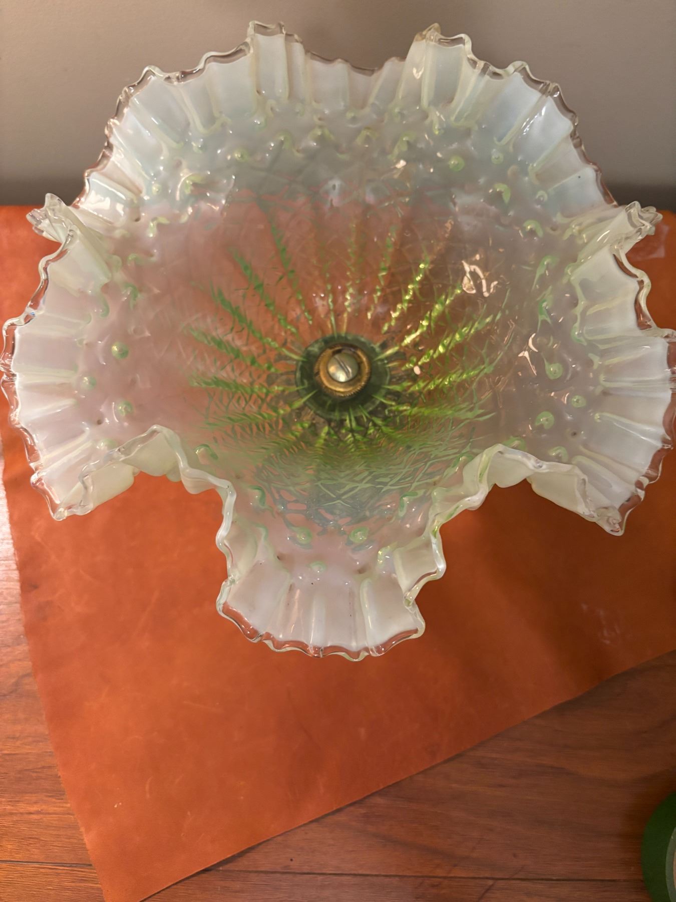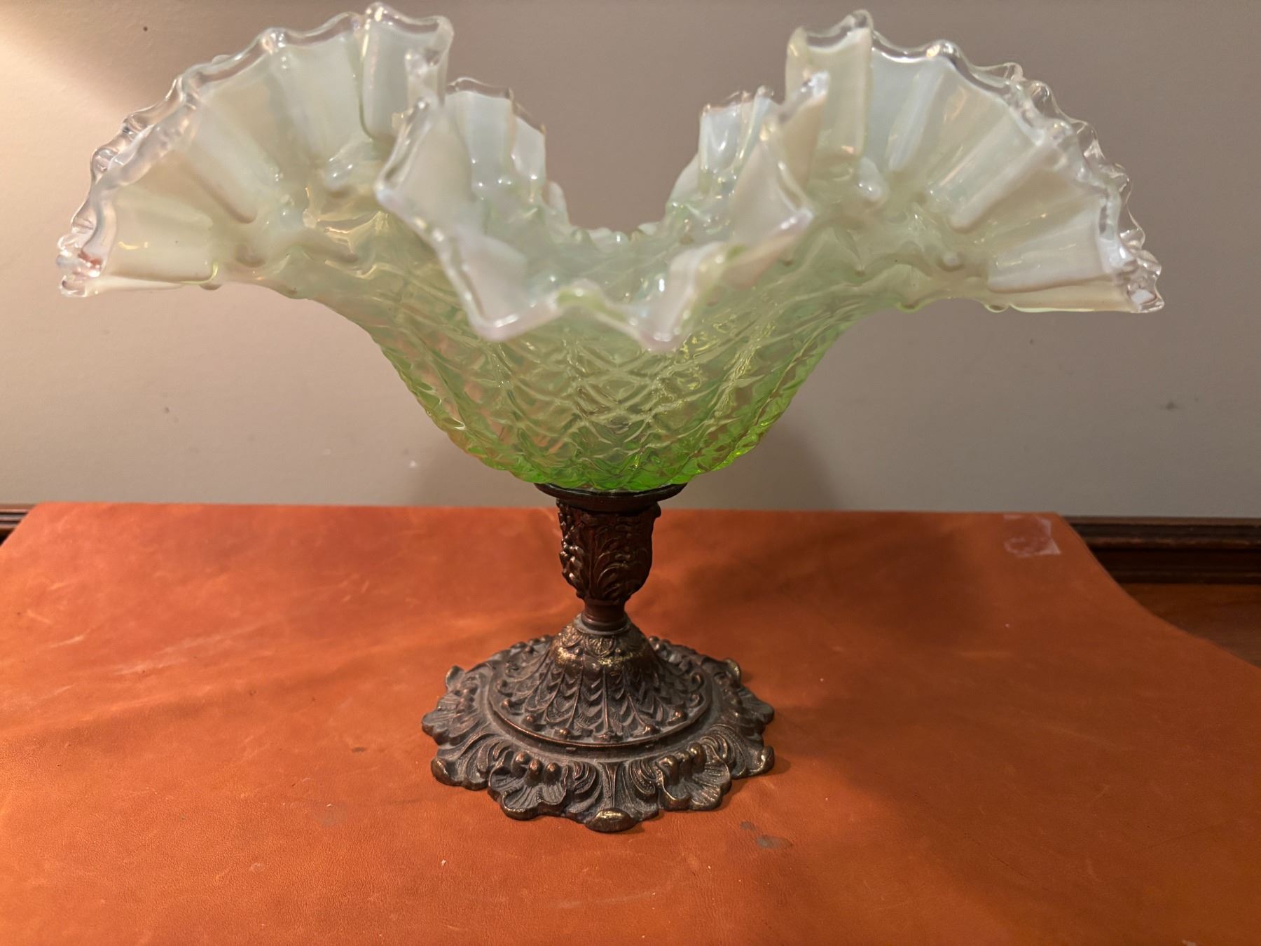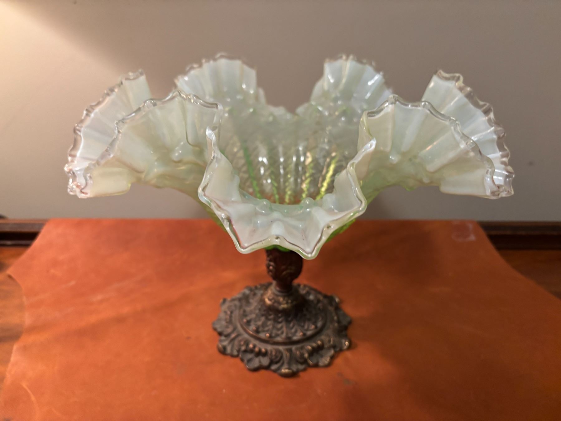 Victorian style, ruffled edge with pale green tint with cast iron base.12” wide x 9 ¼ high