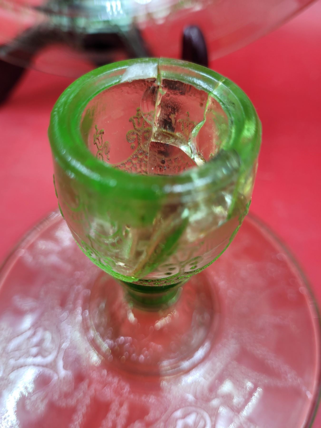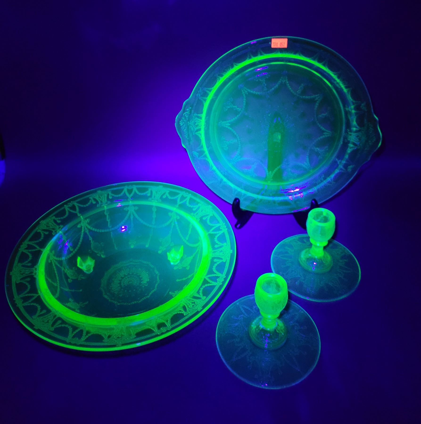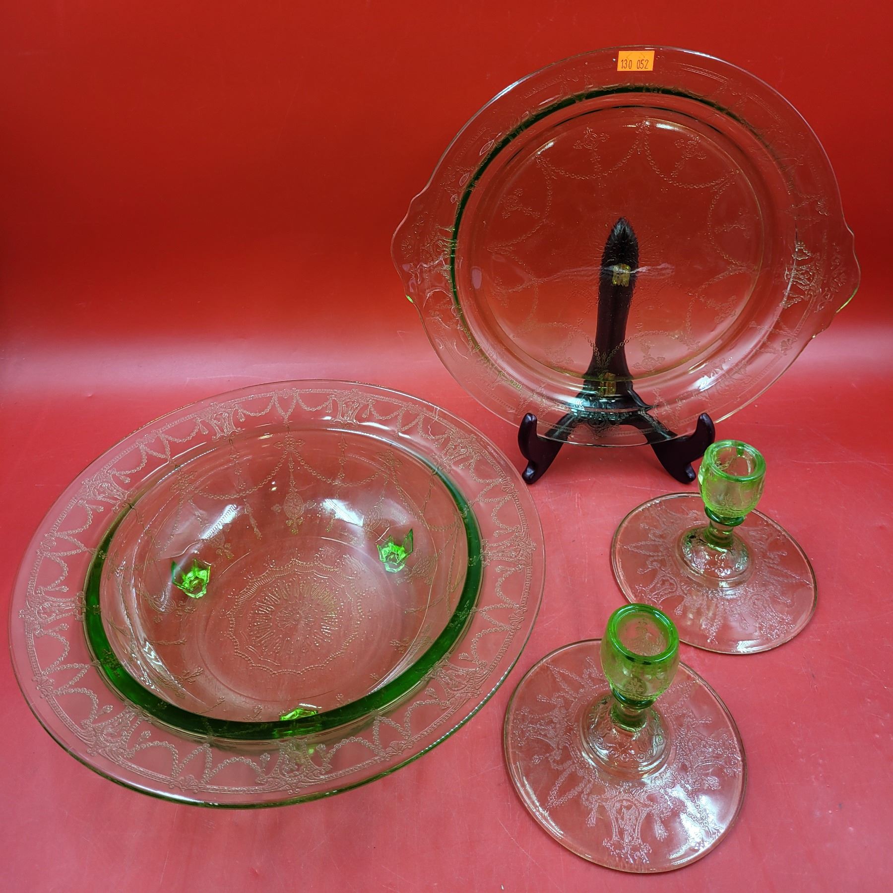Uranium Glass Lot w/ 2 Candleholders, 11" Footed Bowl, & 10.5" Platter