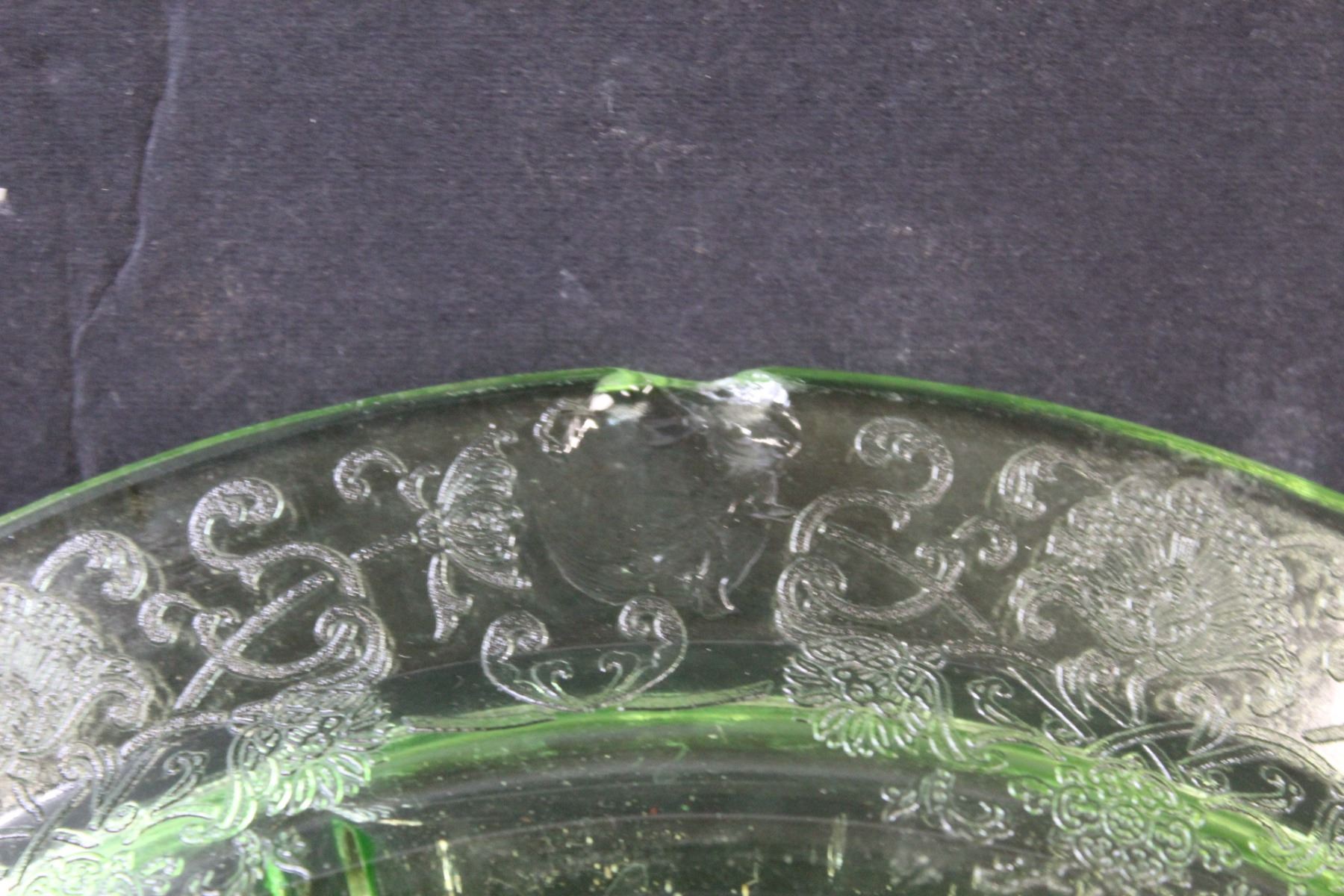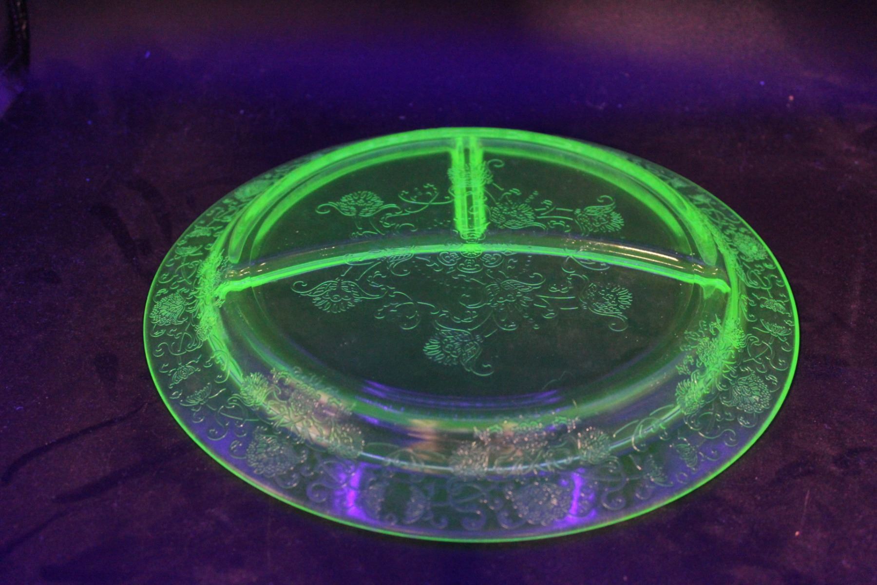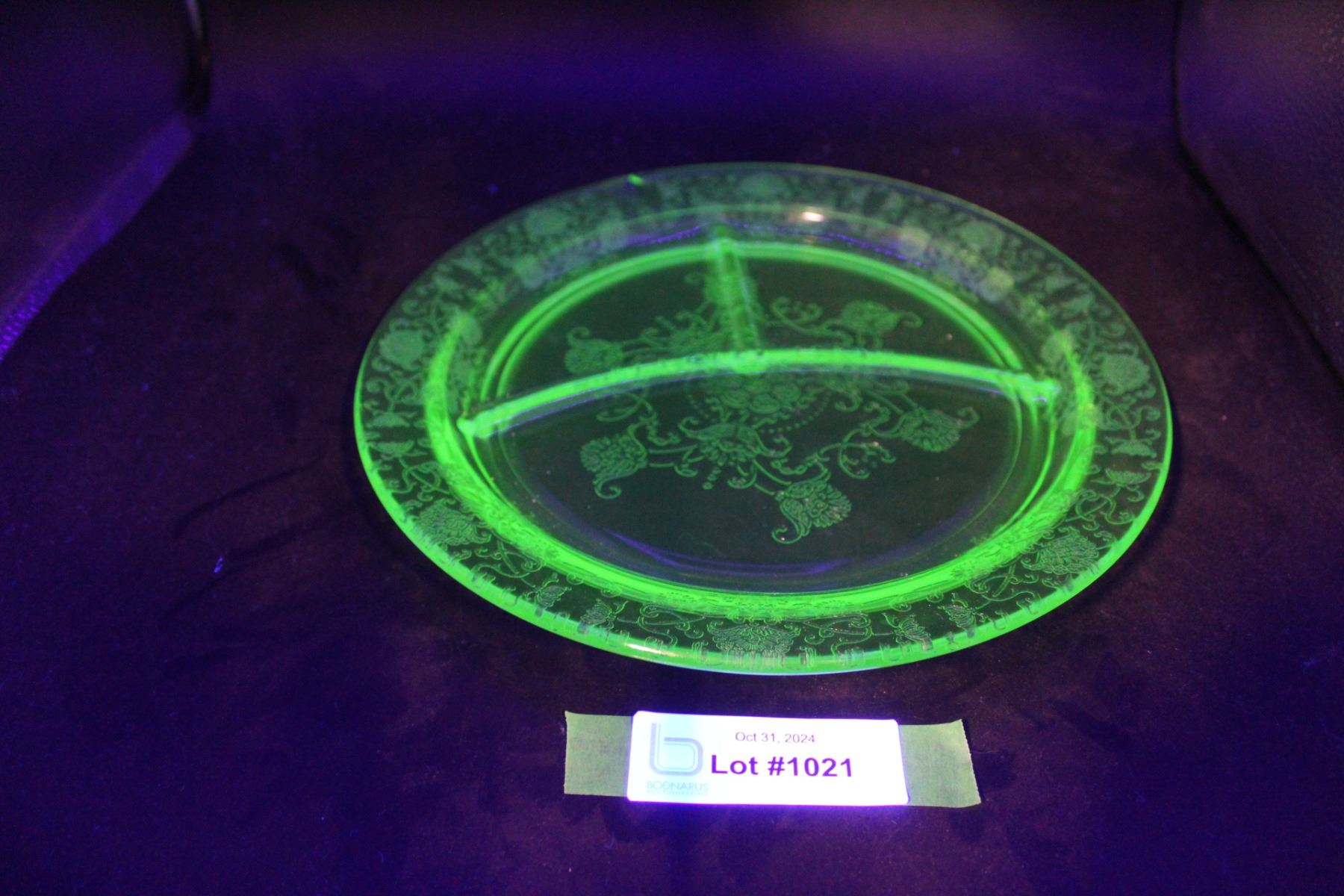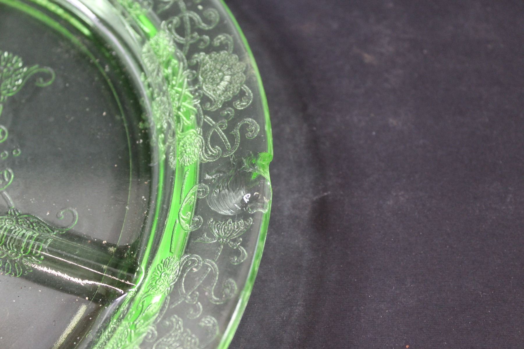Uranium Glass Plate - Hazel Atlas Florentine Pattern - 10.5" - Has Chip