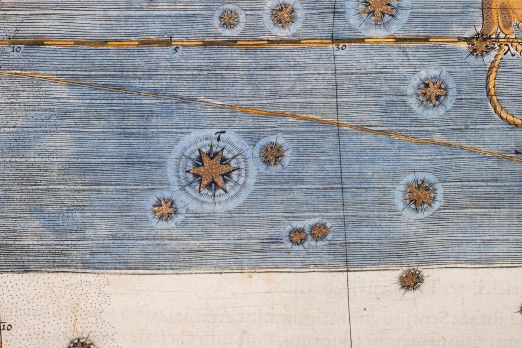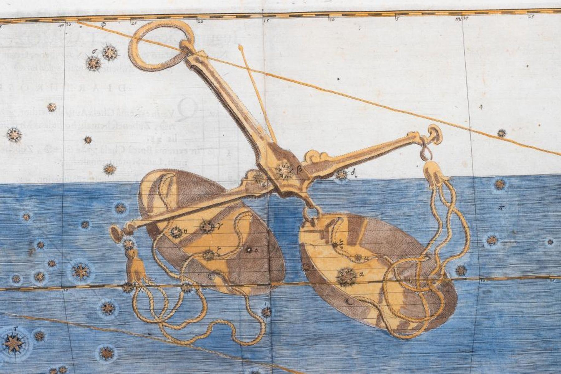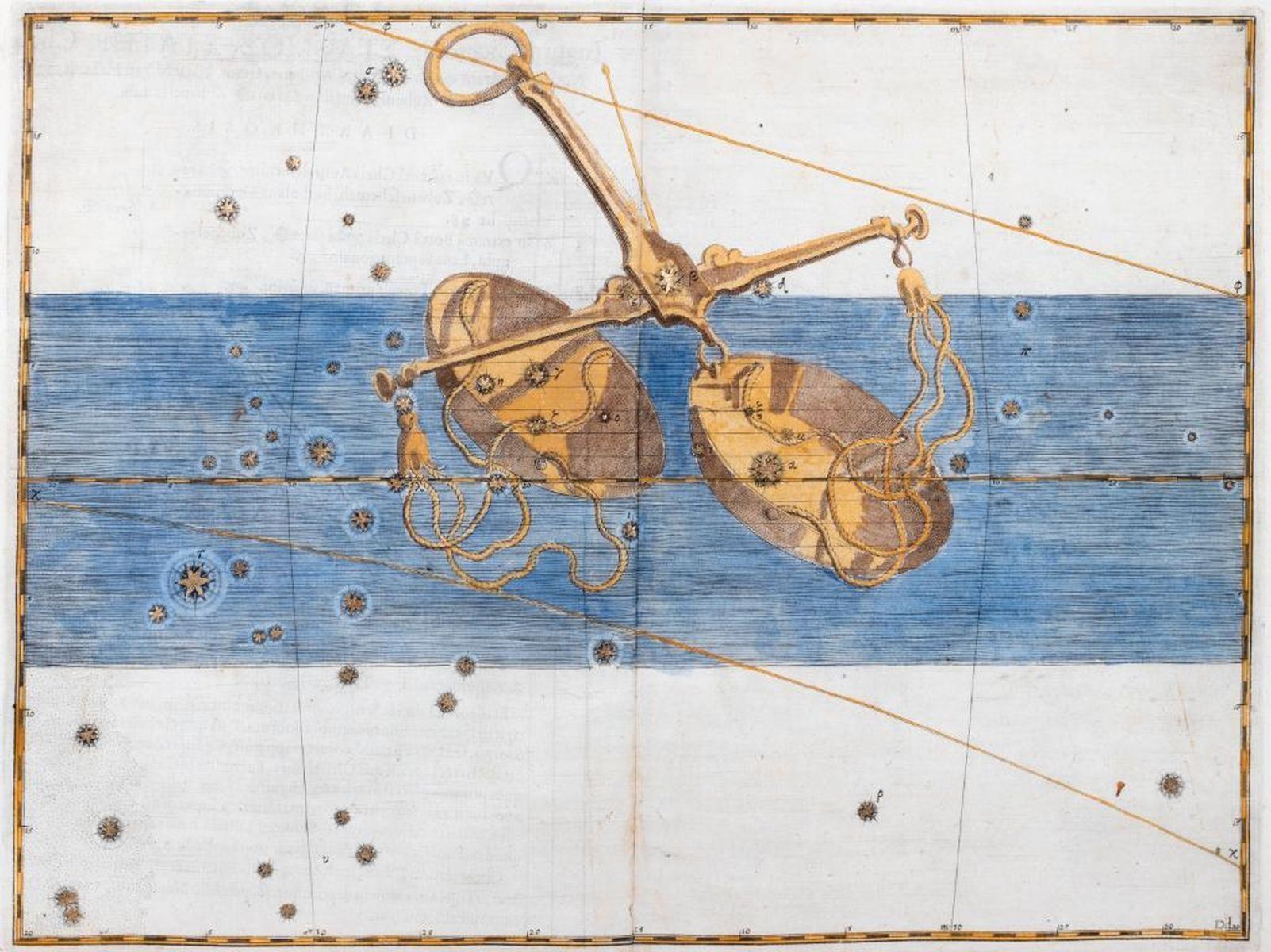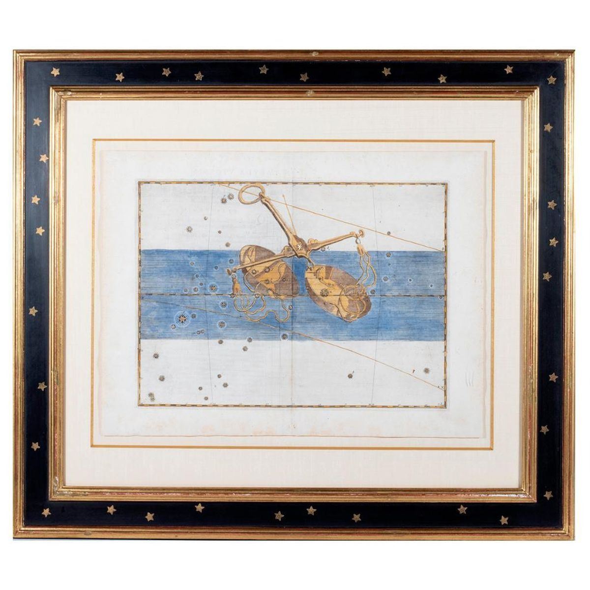 Copper-plate engraving, hand-colored on laid paper. Libra, from Uranometria. Originally publisher Augsburg, 1603. sight: 18in. x 13in. framed: 27in. x 24in.